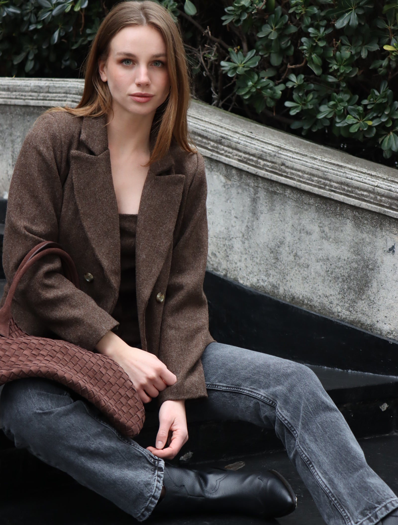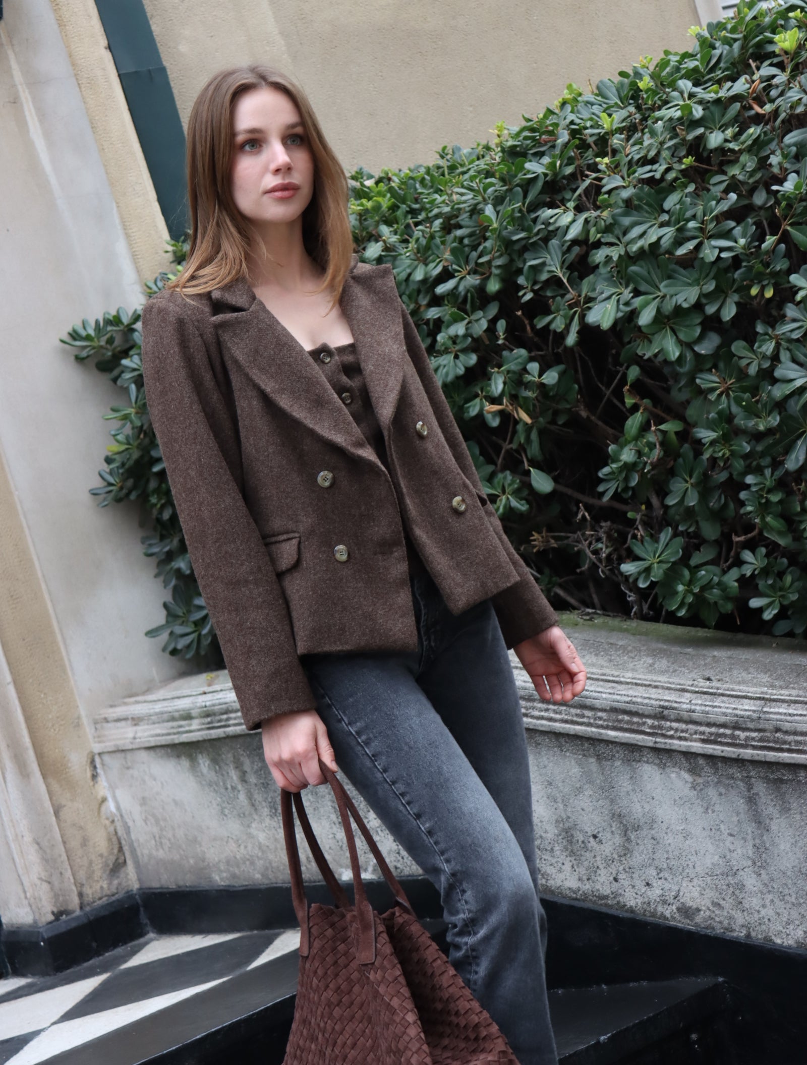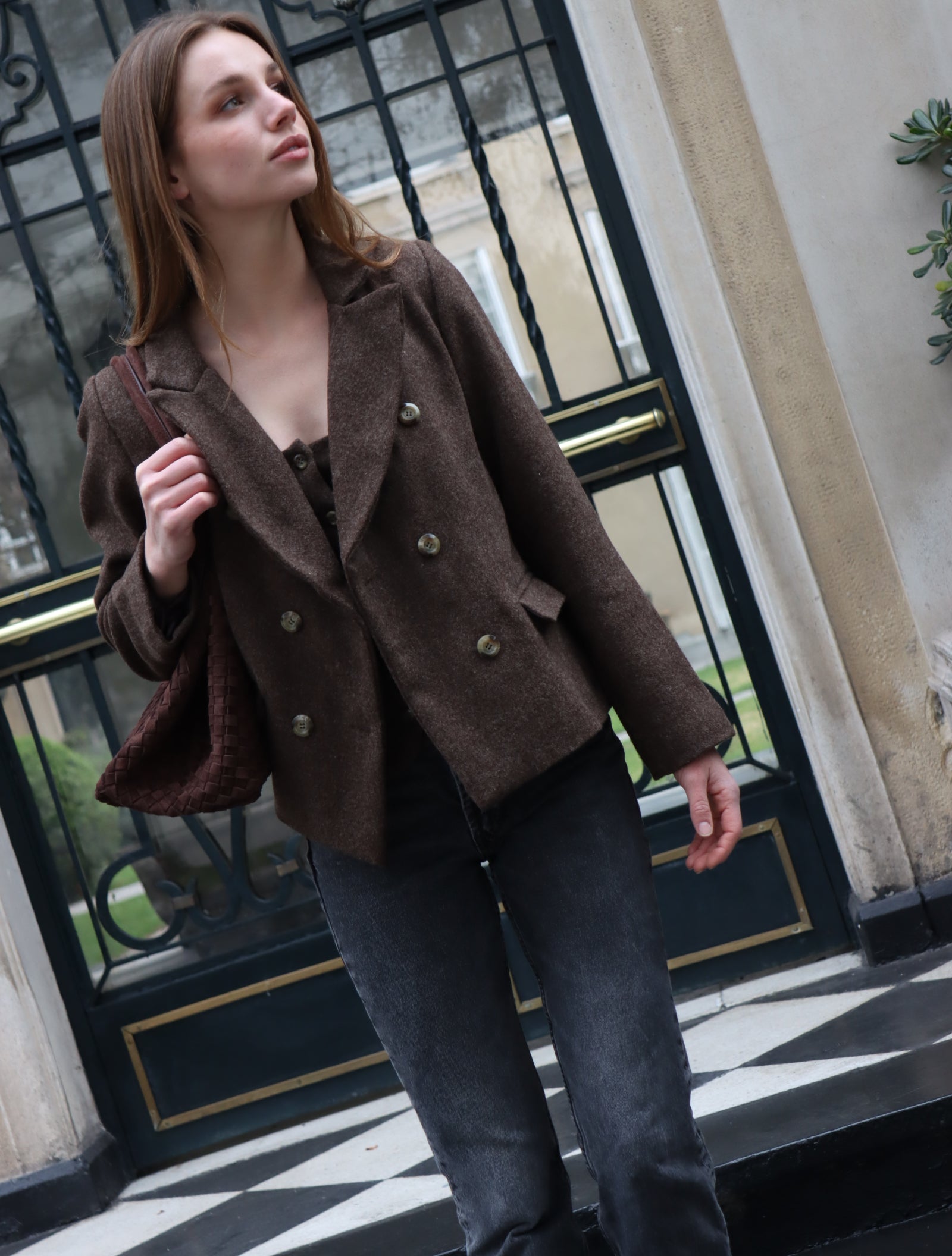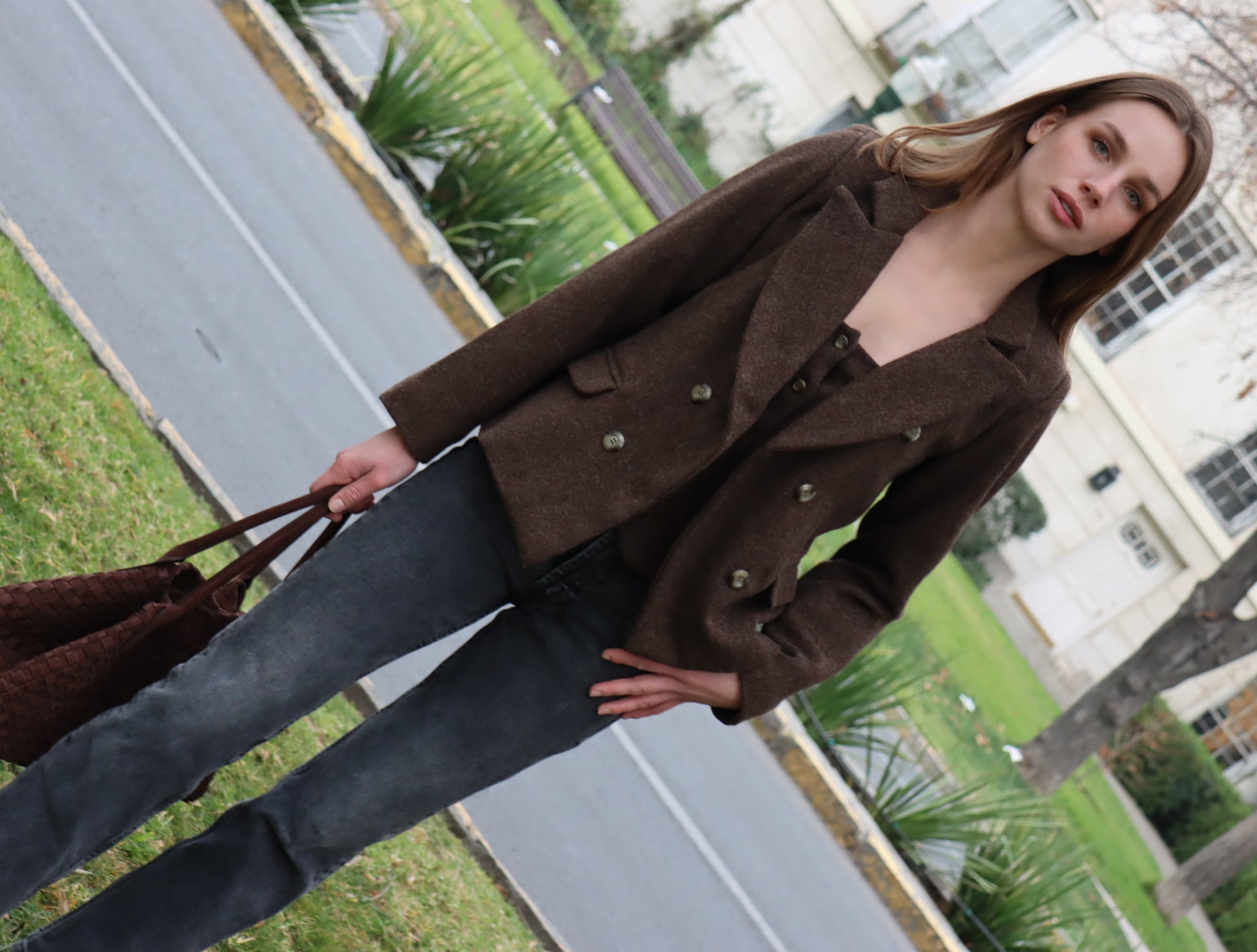 Blazer sastre 100% lana, con silueta ajustada, forrado interiormente, cruce de doble botón y hombreras estructuradas.