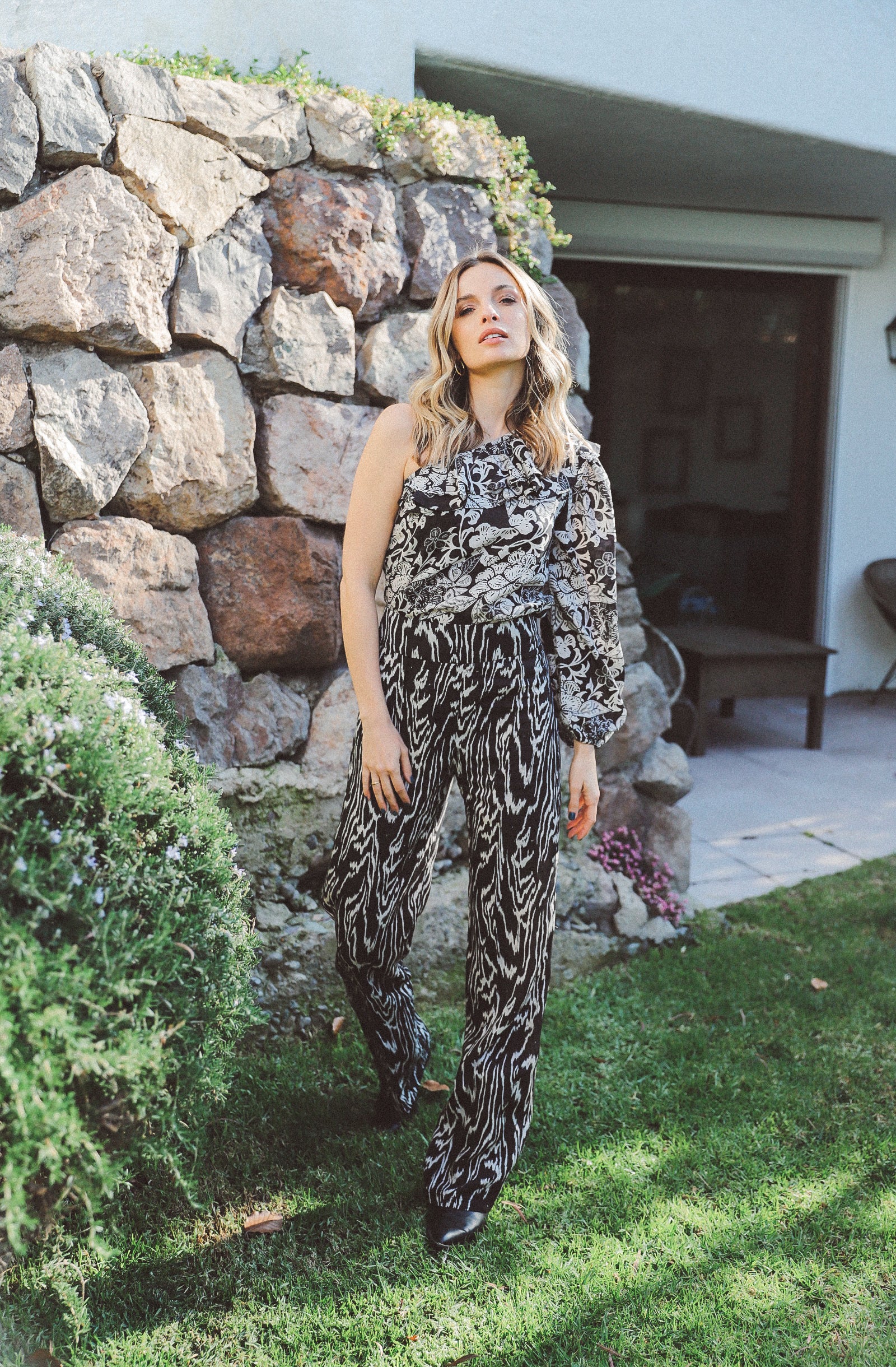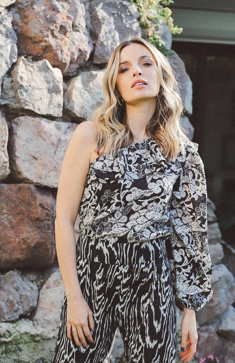 Blusa en tela 100% tencel con un hombro, doble vuelo en escote, manga globo con elastico y cierre lateral.
