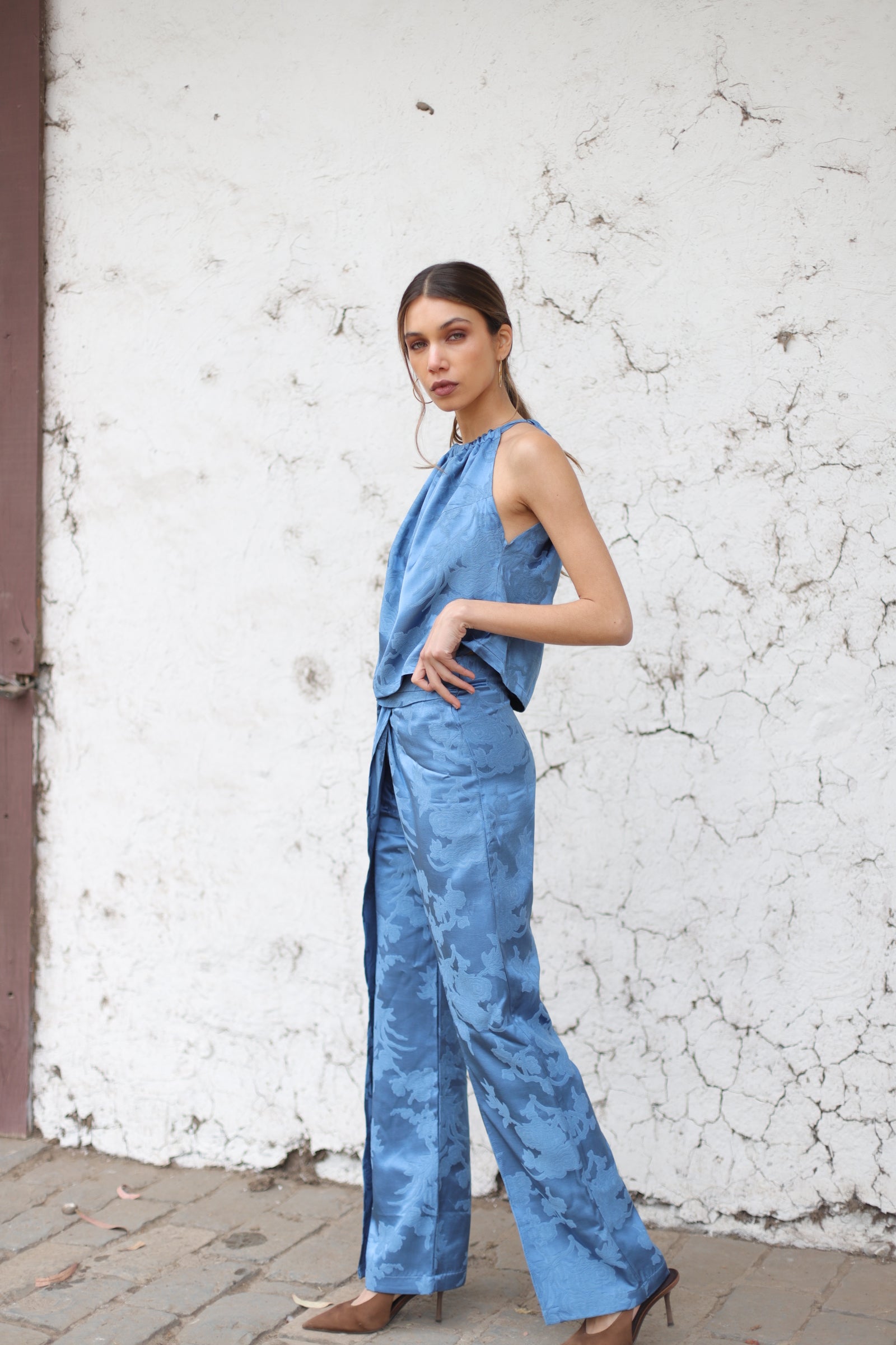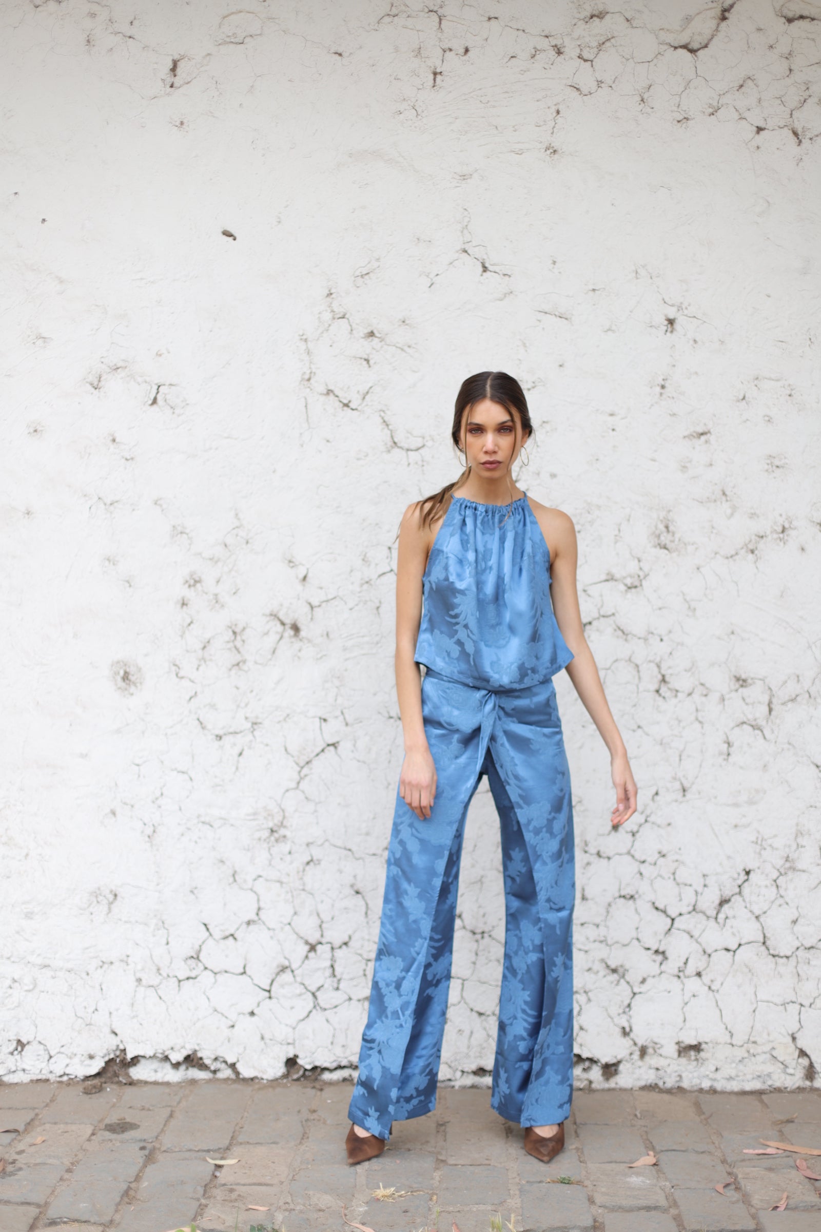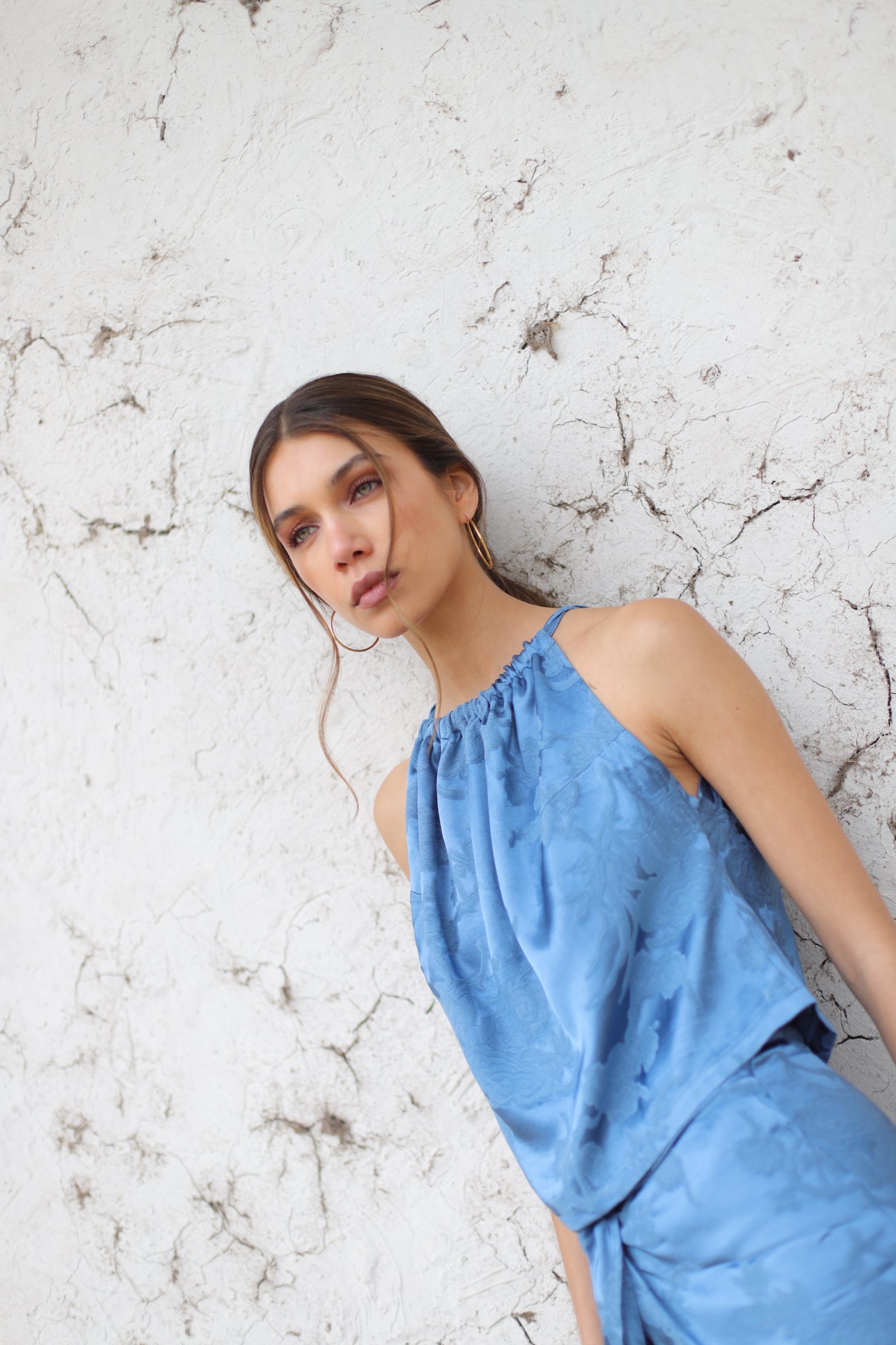 Top halter de silueta fluida confeccionado en tejido jacquard floral satinado, con un delicado juego de brillos y relieves que aportan textura y sofisticación. El motivo floral está integrado en la trama de la tela, logrando un acabado elegante y de alta calidad.