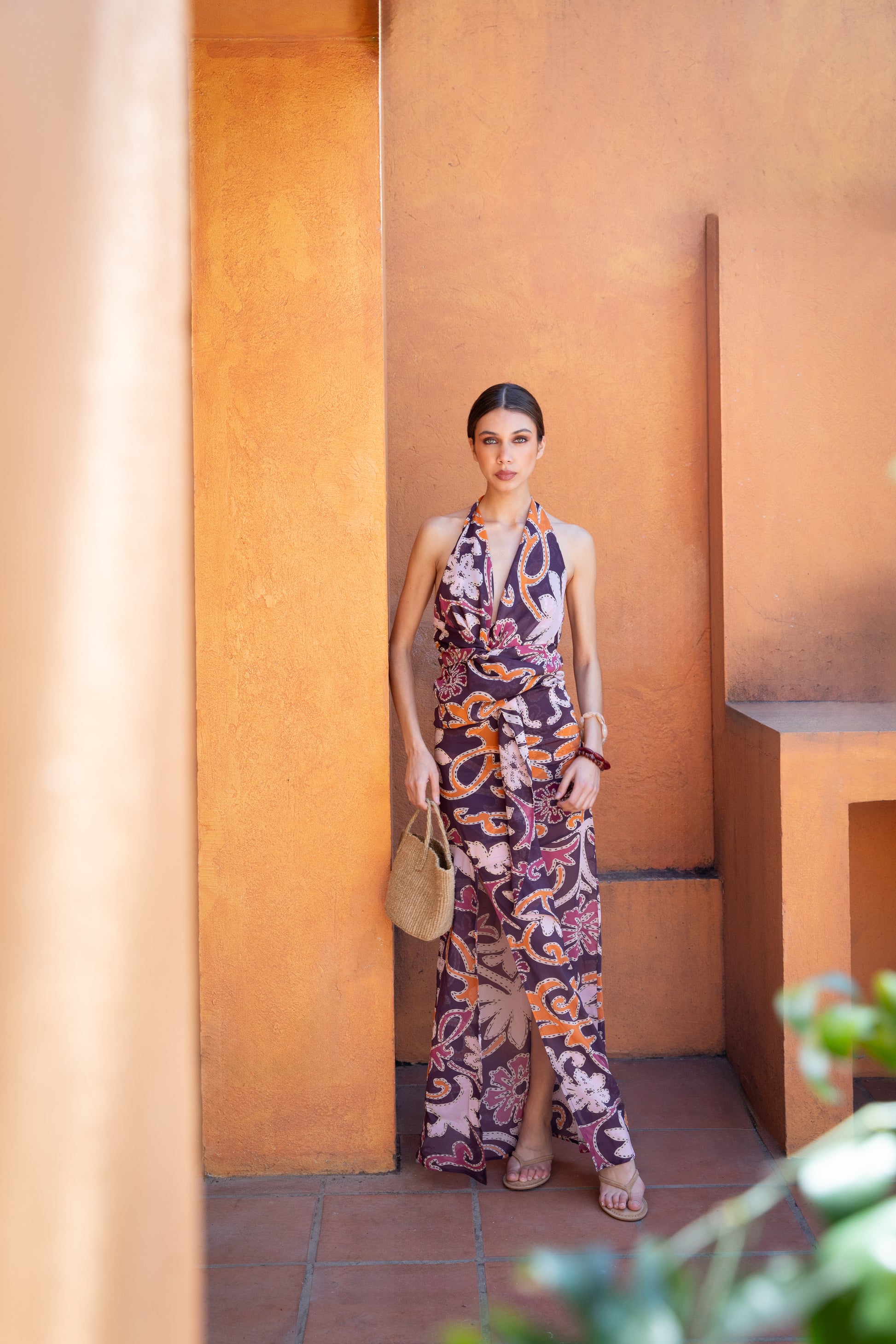 Presenta un estampado figurativo en tonos intensos, inspirado en los telares tradicionales mexicanos, que aporta carácter y personalidad a la prenda.