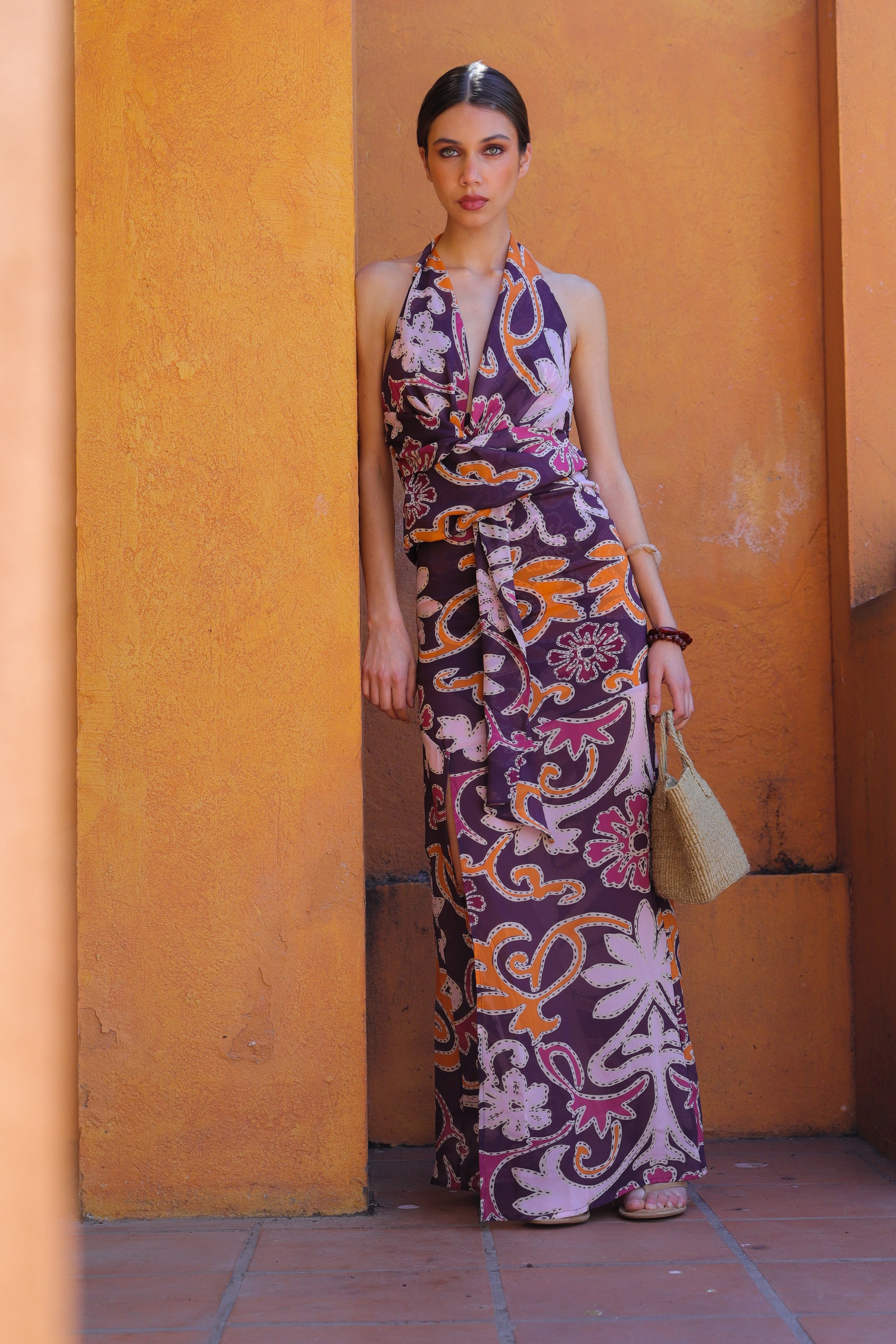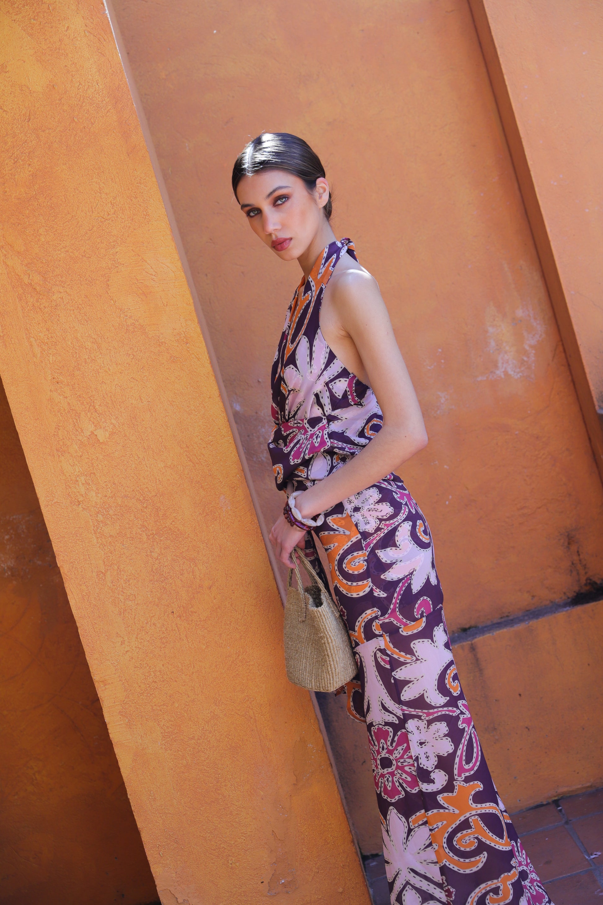Blusa halter de espalda descubierta con ajuste en la cintura, confeccionada en gasa 100% viscosa que ofrece una caída liviana, suave y vaporosa.