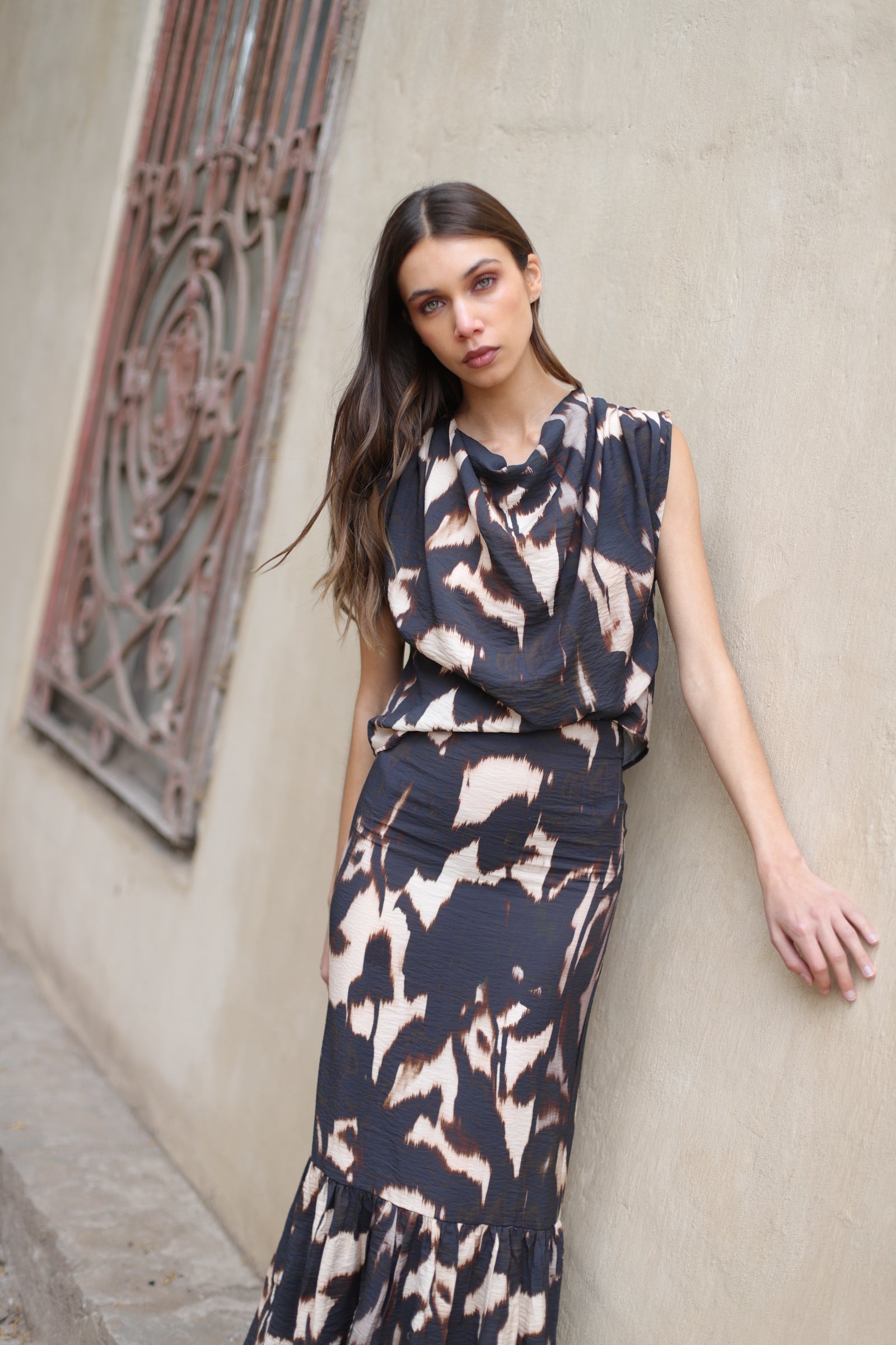 Esta blusa destaca por su diseño elegante y contemporáneo. Confeccionada en un tejido ligero de textura suave y ligeramente arrugada, ofrece una caída fluida que aporta movimiento y sofisticación. Su escote drapeado crea un efecto delicado y moderno, realzando la silueta sin perder comodidad. El estampado, de inspiración abstracta con tonos negro, marrón y beige, añade personalidad y un toque artístico a la prenda. Perfecta para crear looks refinados y versátiles, esta blusa combina estilo, originalidad y un acabado impecable ideal para cualquier ocasión.