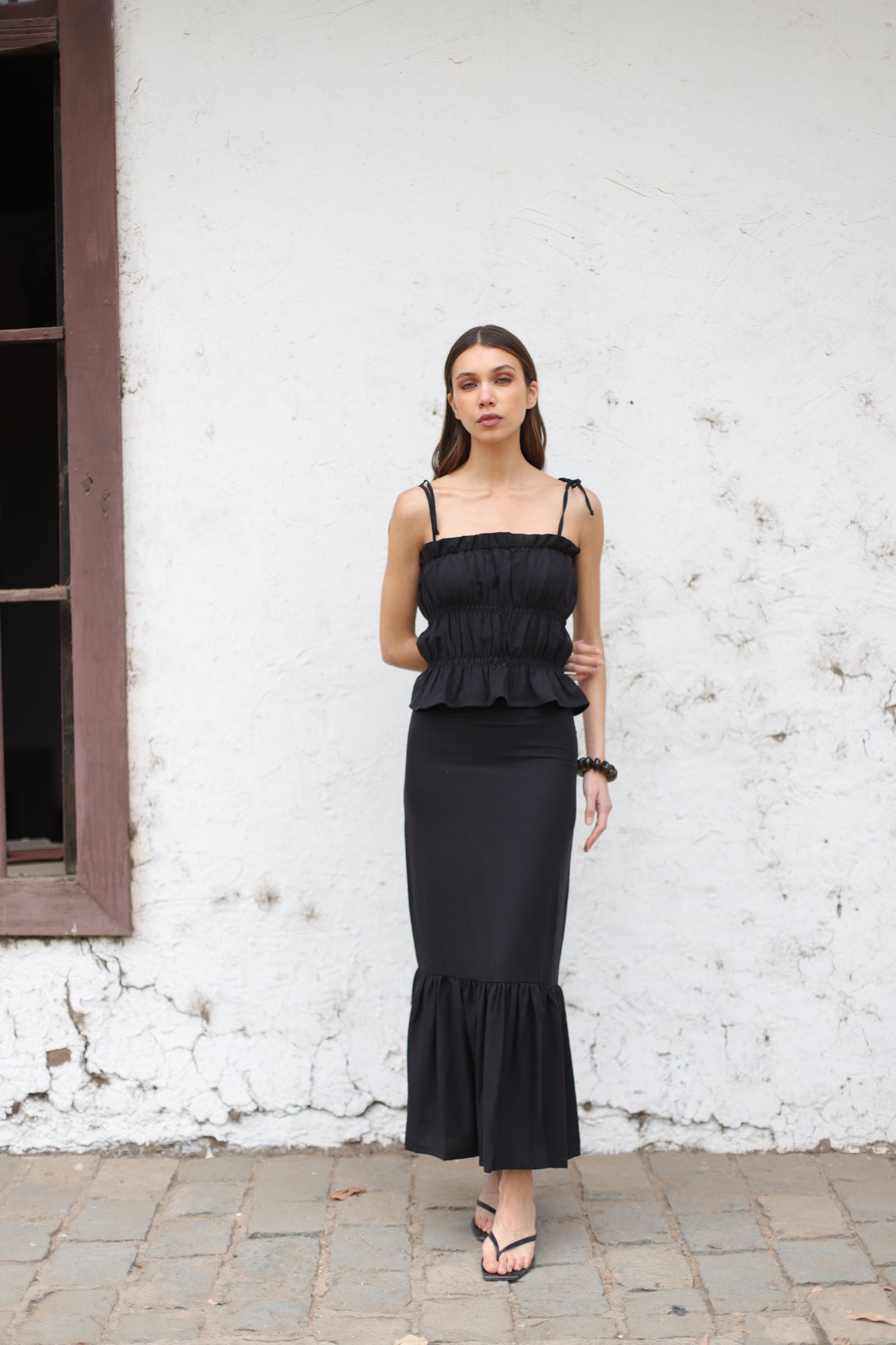Blusa campesina dividida con delicados ajustes de panal que forman tres franjas, aportando textura y movimiento. Sus tirantes de pabilo se amarran en cintas para regular el calce. Hecha a mano en Chile en una tela fresca y liviana de 70% lyocell y 30% lino.