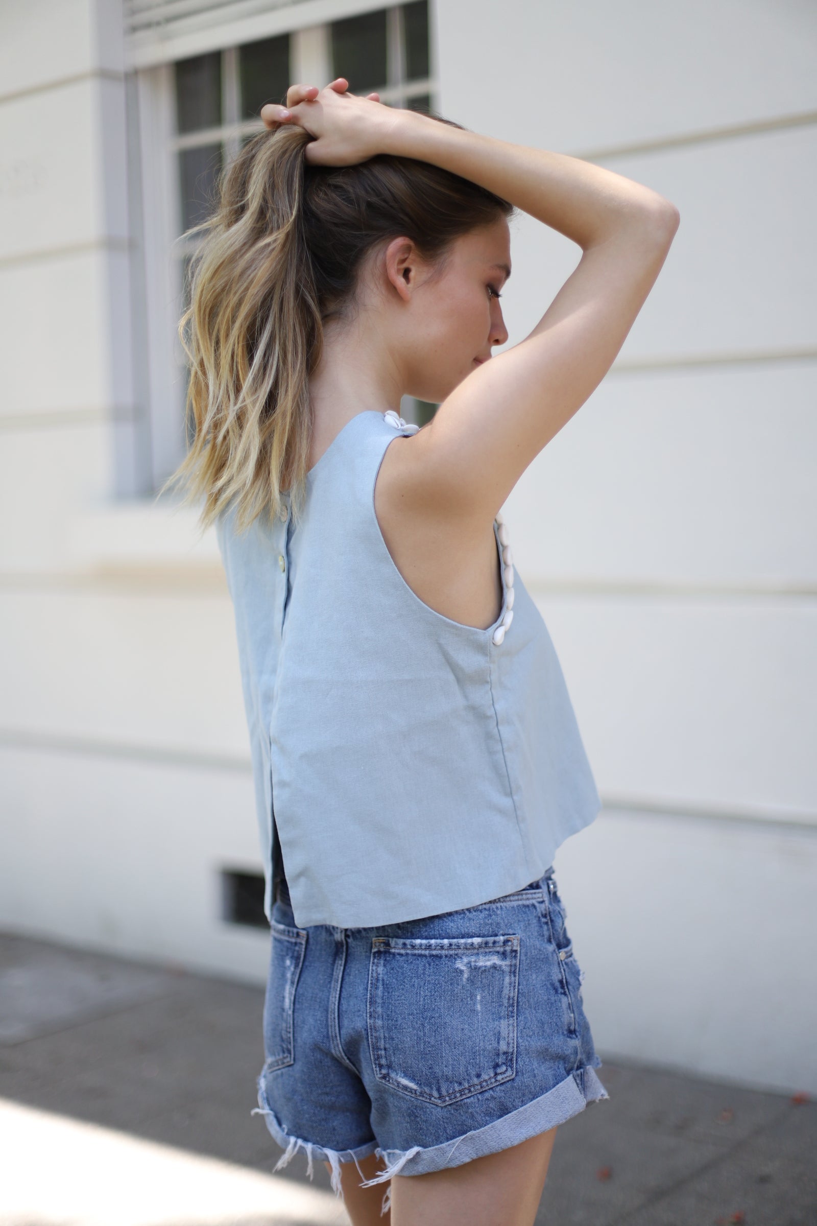 Descubre la blusita ideal para este verano: una preciosa blusa de viscosa y lino en un suave tono celeste. Su diseño presenta un cuello musculoso y un delicado bordado de conchitas, meticulosamente elaborado a mano por talentosas mujeres. La espalda abierta, adornada con dos botones en forma de concha perla, añade un toque de sofisticación y frescura a tu look.