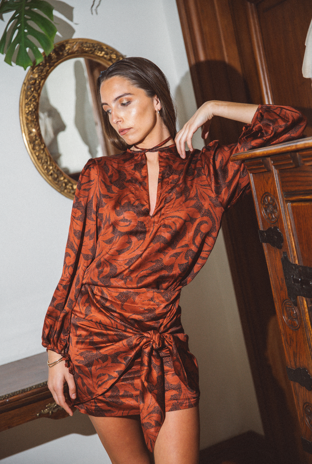Blusa en tela rayon / viscosa satin tipo tunica con manga globo, ojal y nudo en cuello con terminación de flecos. Tela diseño de autor.