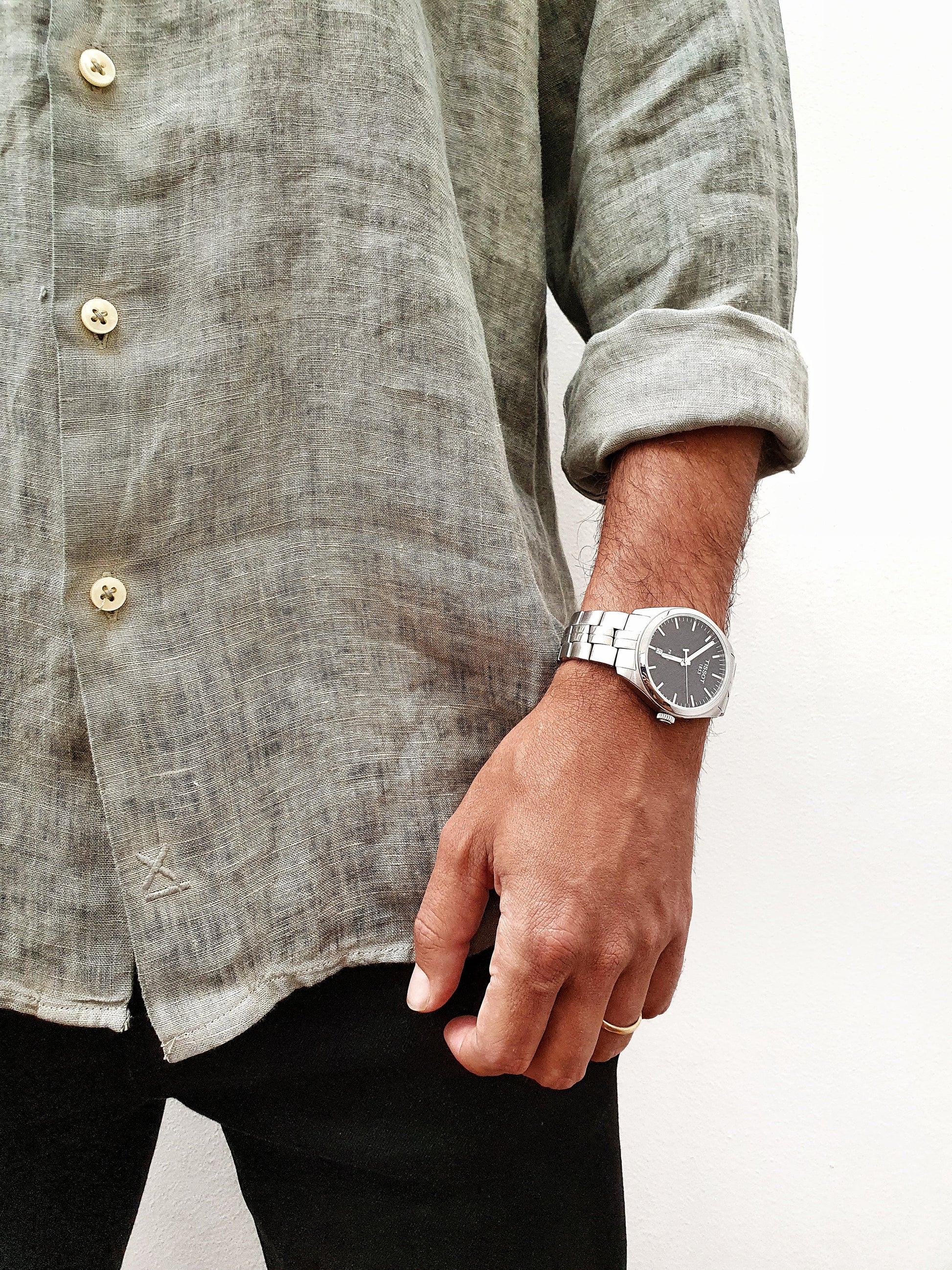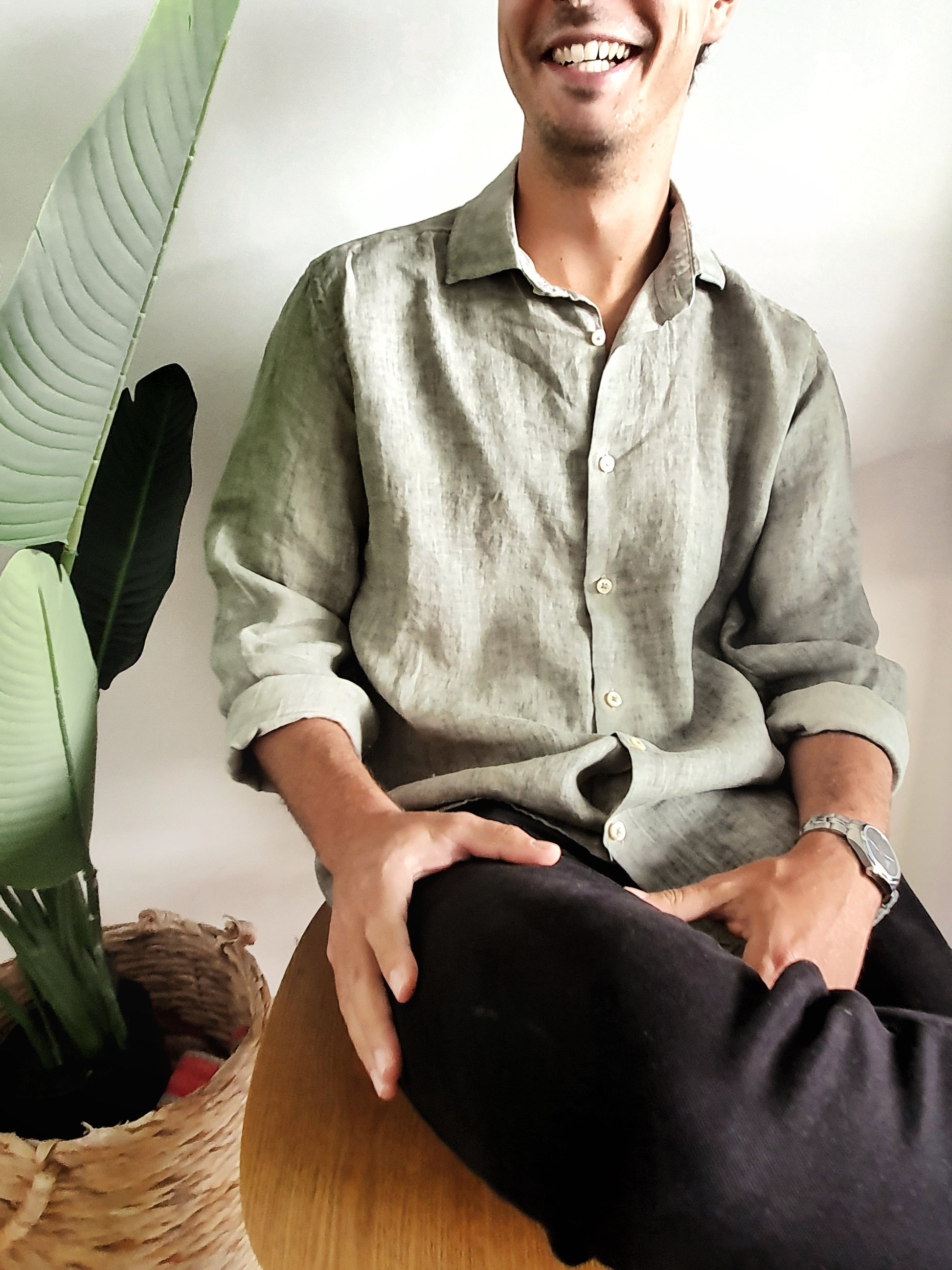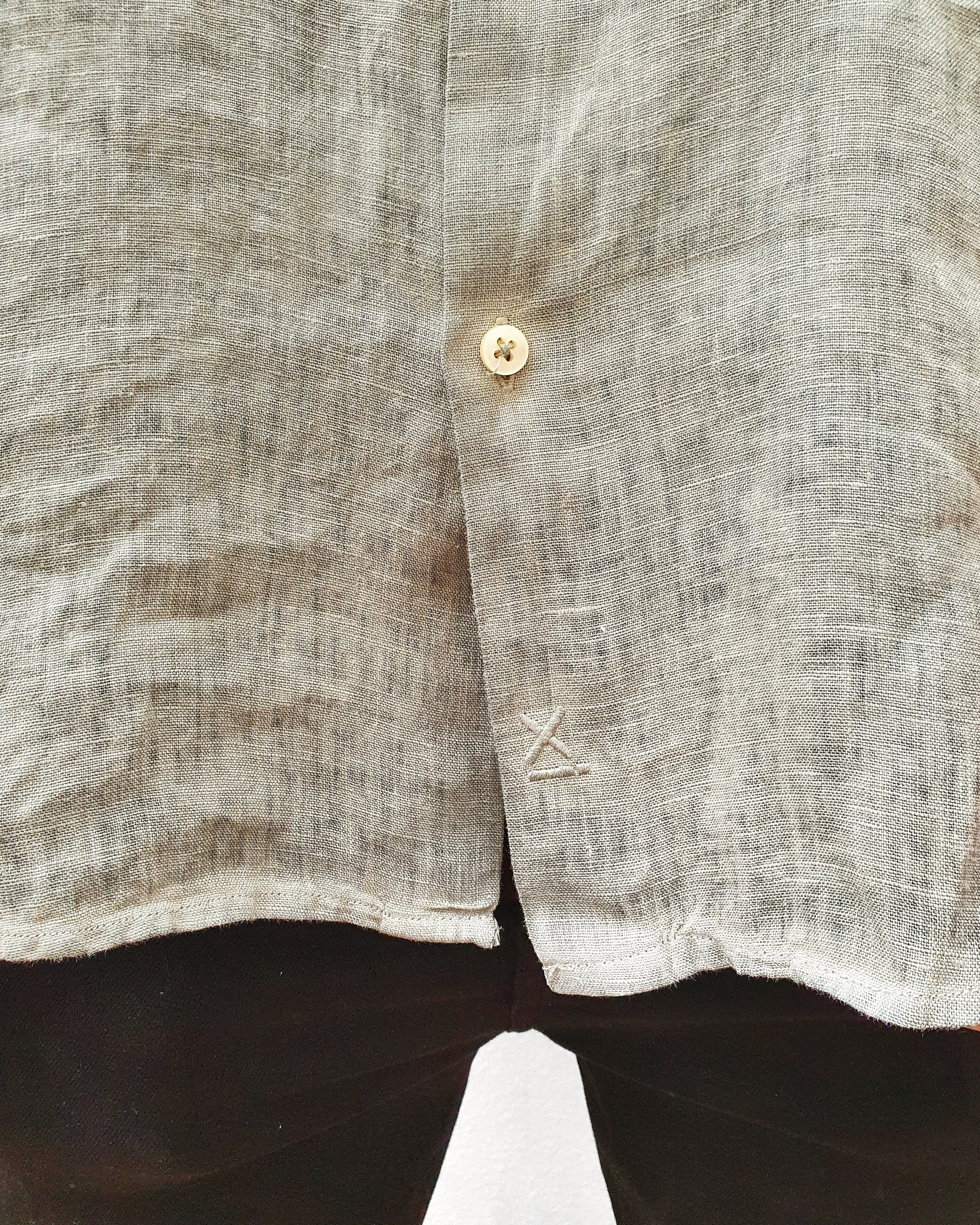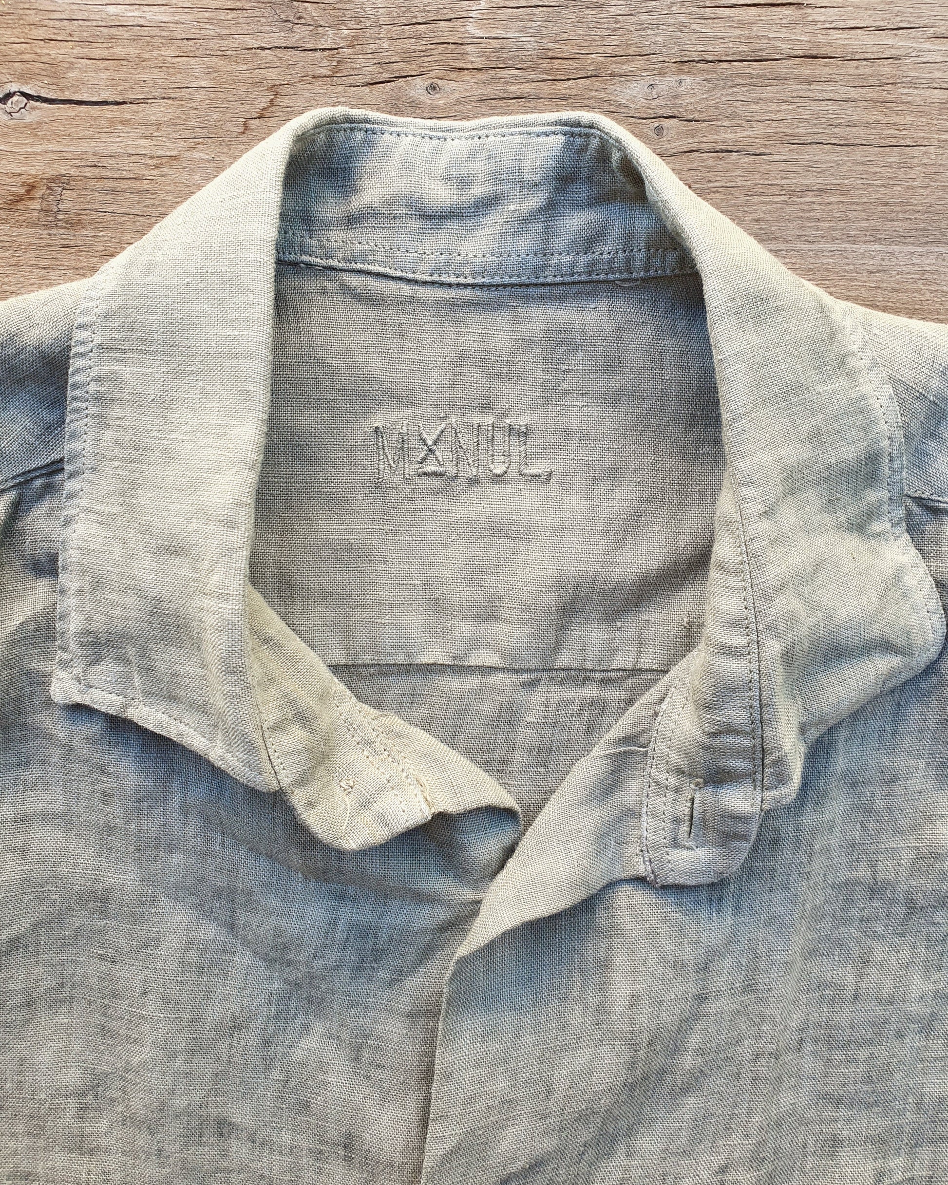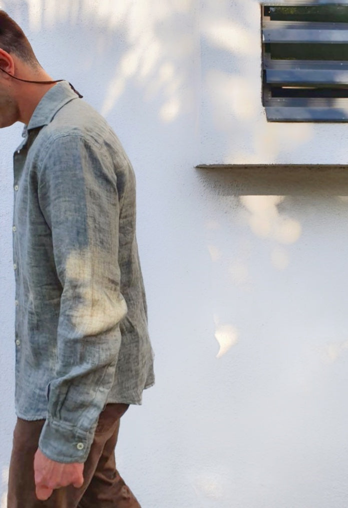 Camisa manga larga 100% lino verde deslavado hecha a mano en España y teñidas con pigmentos naturales.