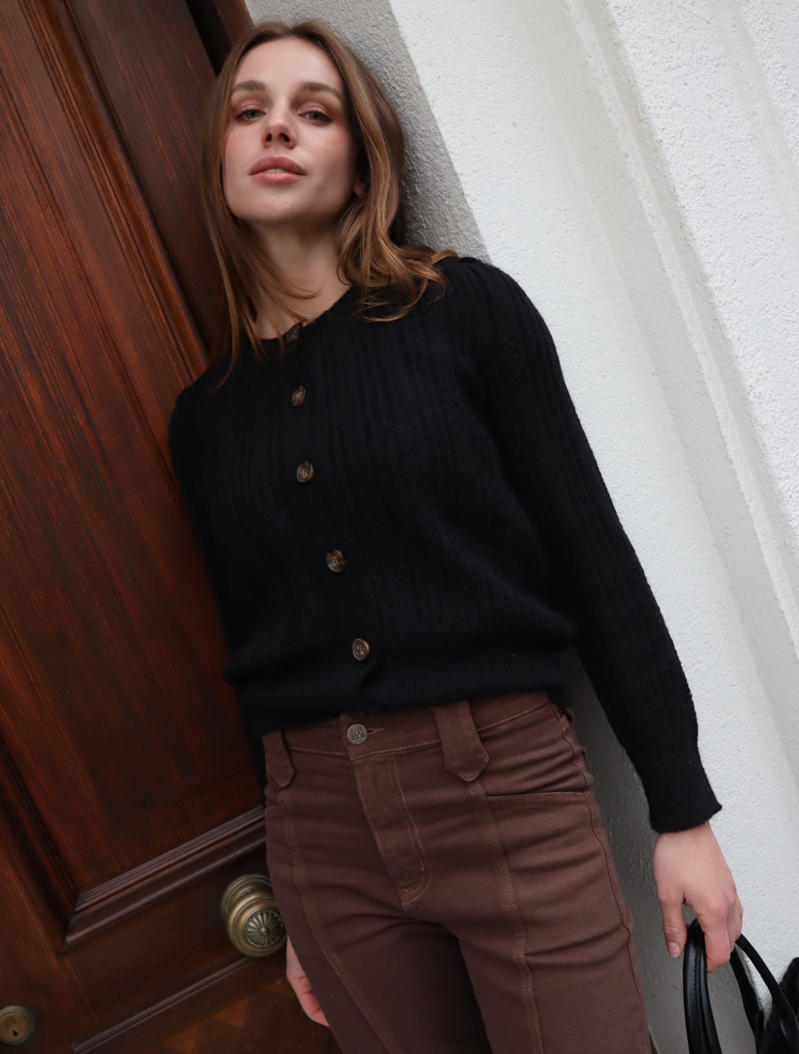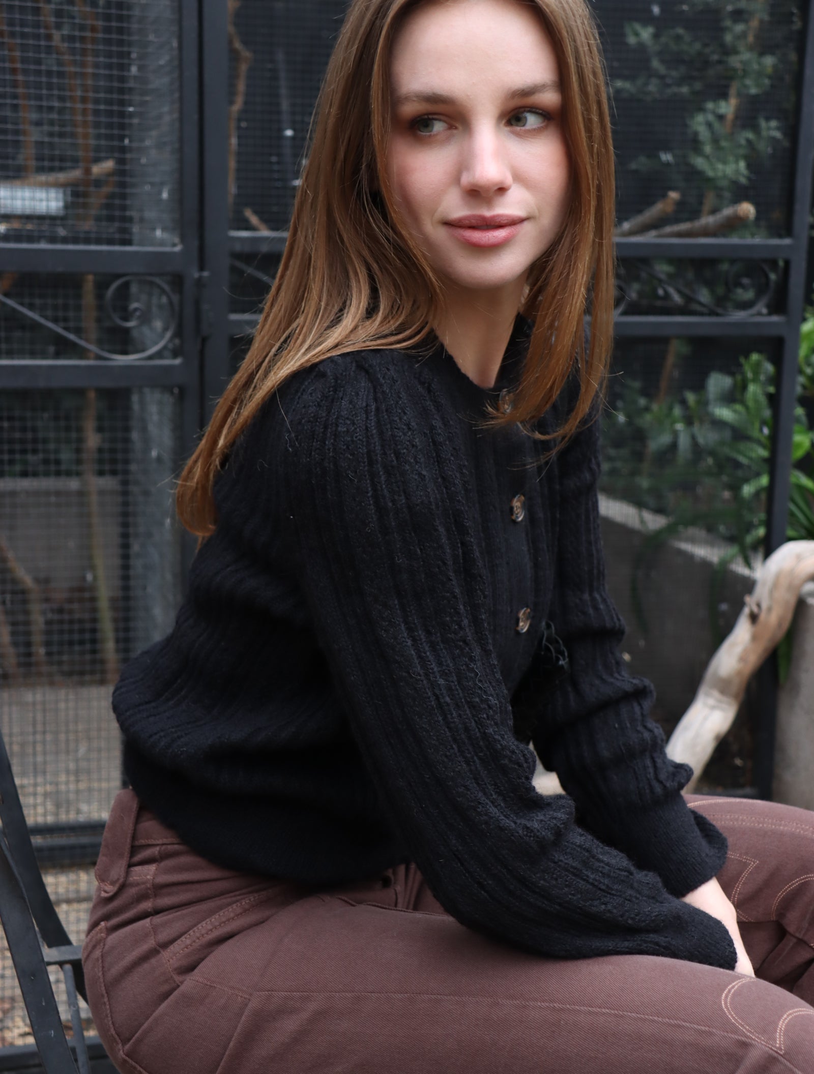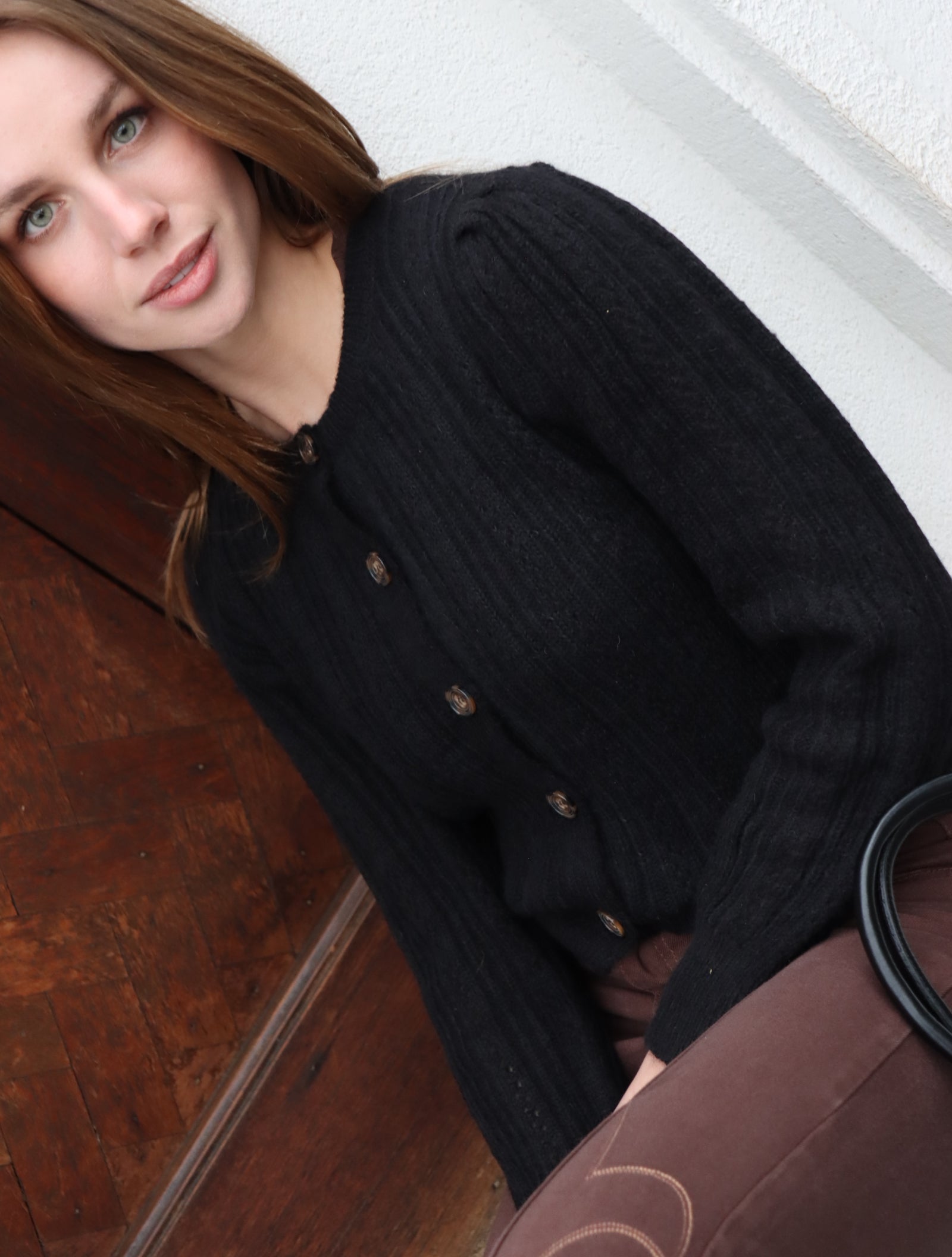 Su diseño calado, combinado con mangas globo sutiles, aporta un toque moderno y único. El abroche de botones carey y el rib en los bordes aseguran un ajuste perfecto, convirtiéndolo en una opción versátil para cualquier ocasión.