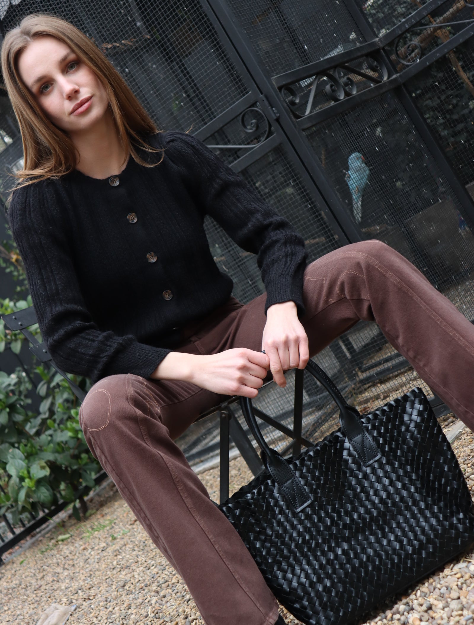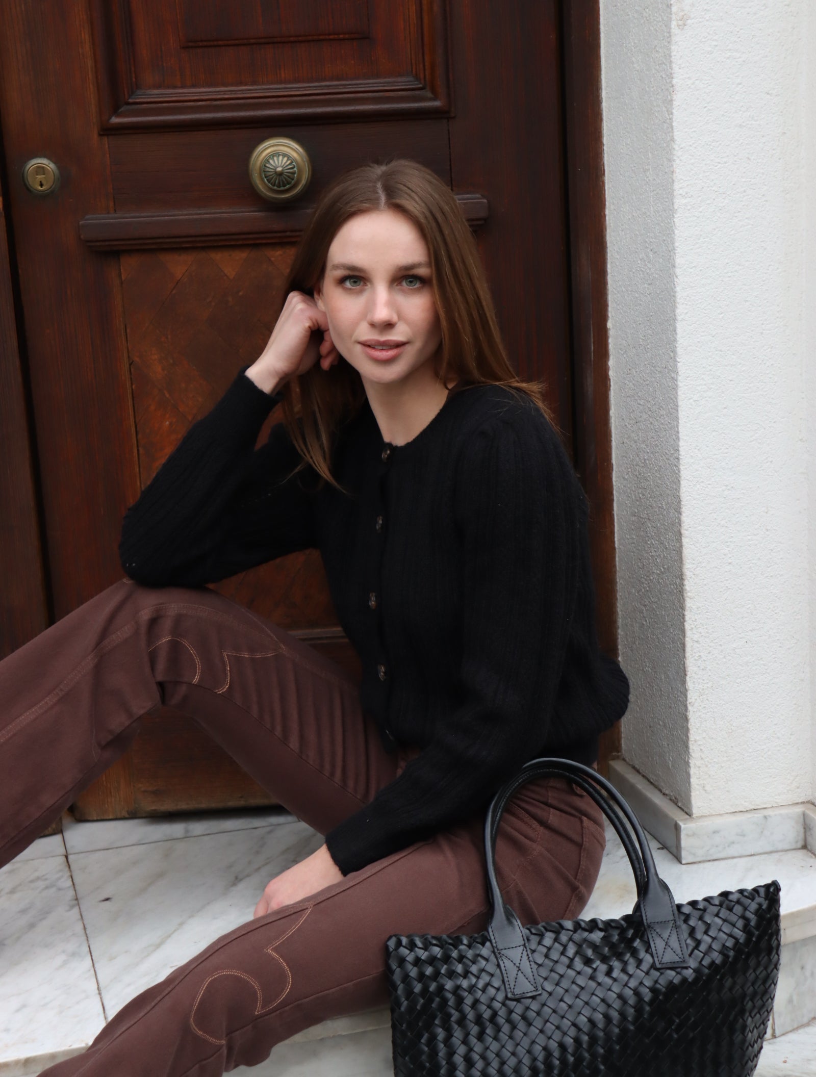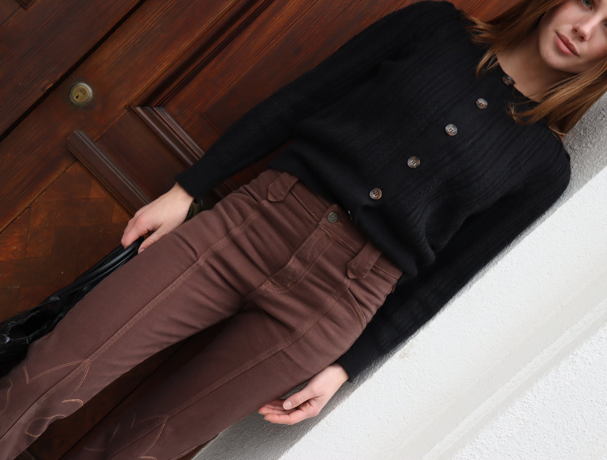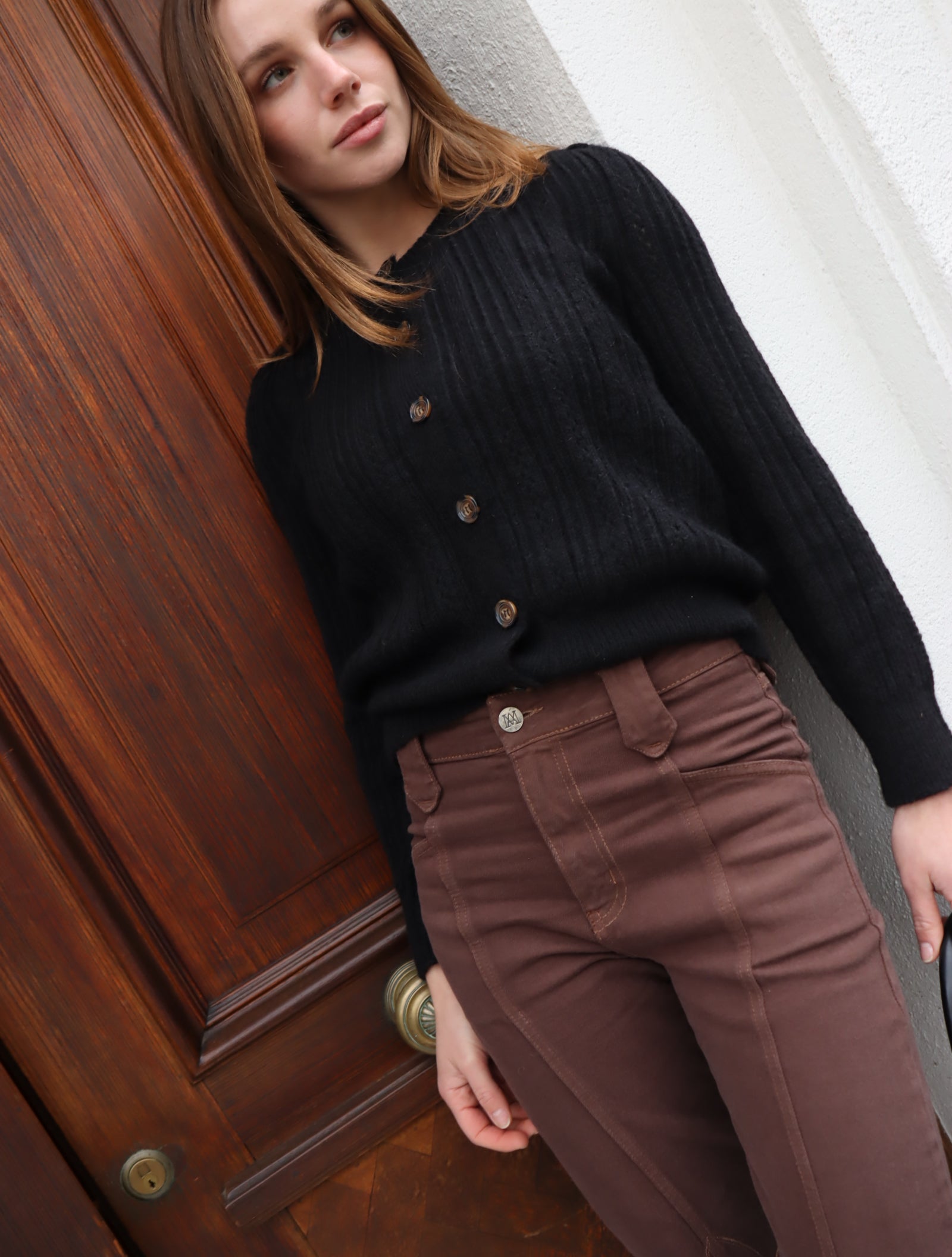 Su diseño calado, combinado con mangas globo sutiles, aporta un toque moderno y único. El abroche de botones carey y el rib en los bordes aseguran un ajuste perfecto, convirtiéndolo en una opción versátil para cualquier ocasión.