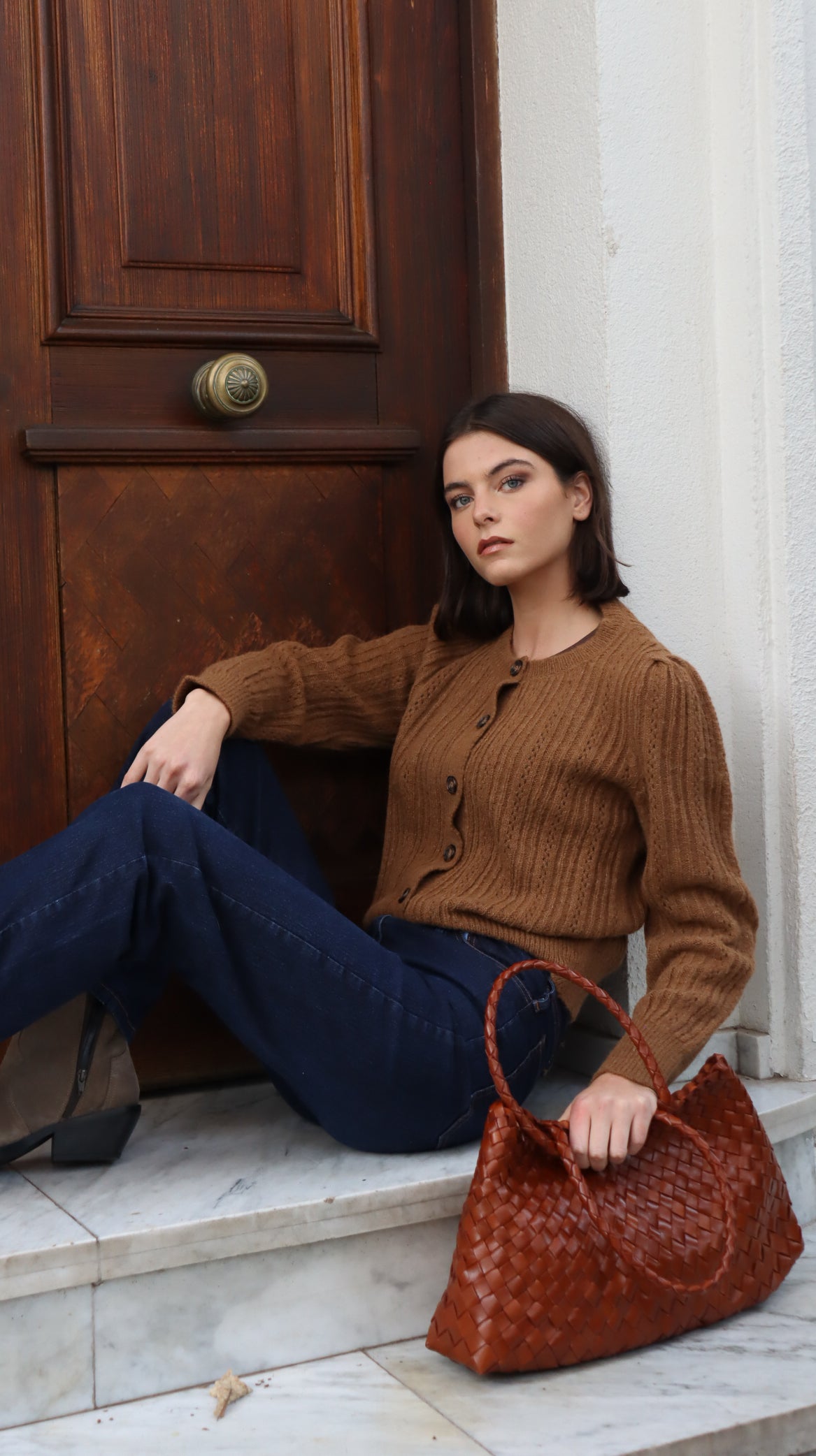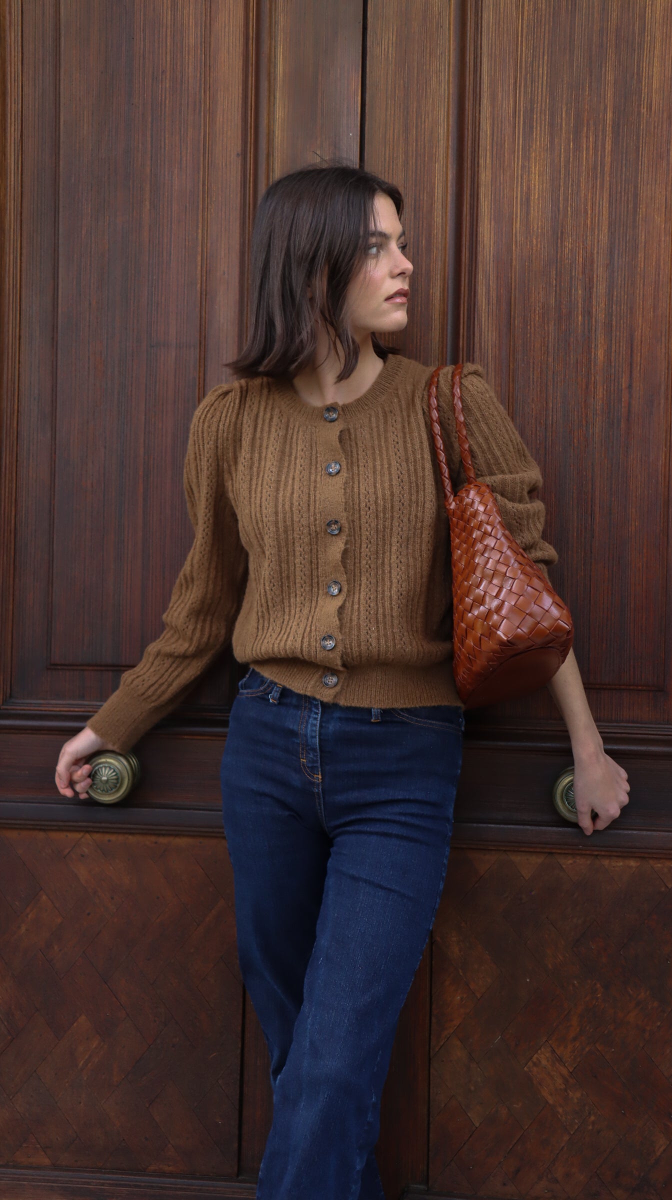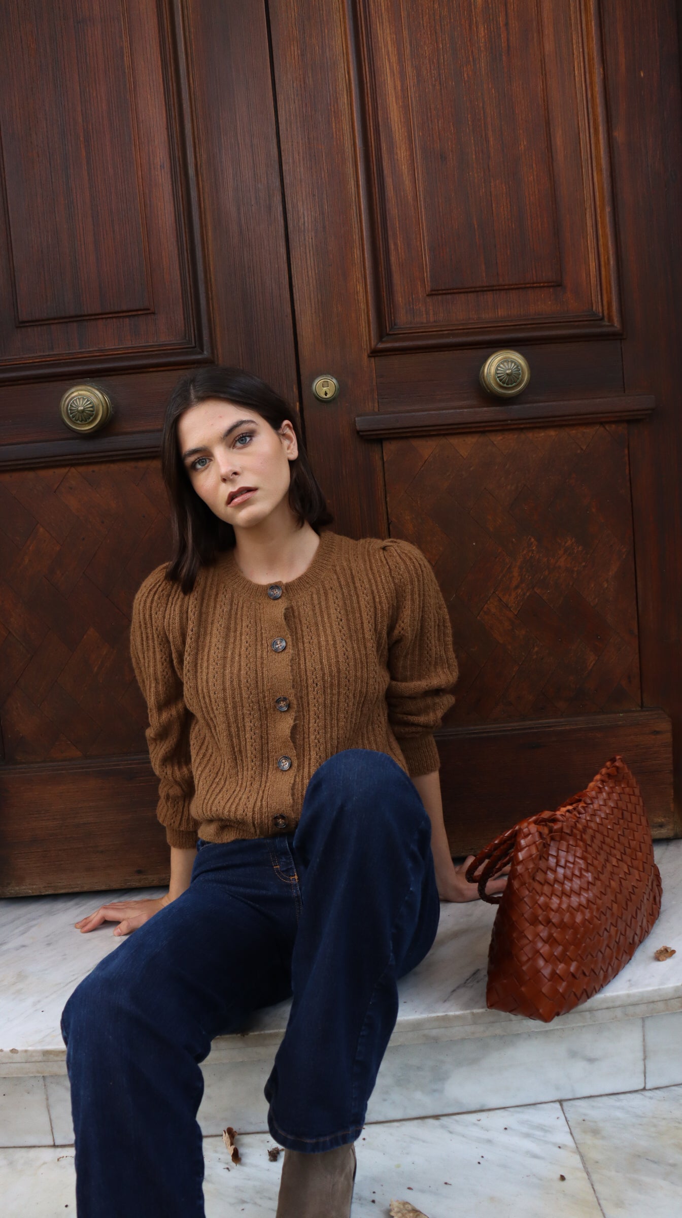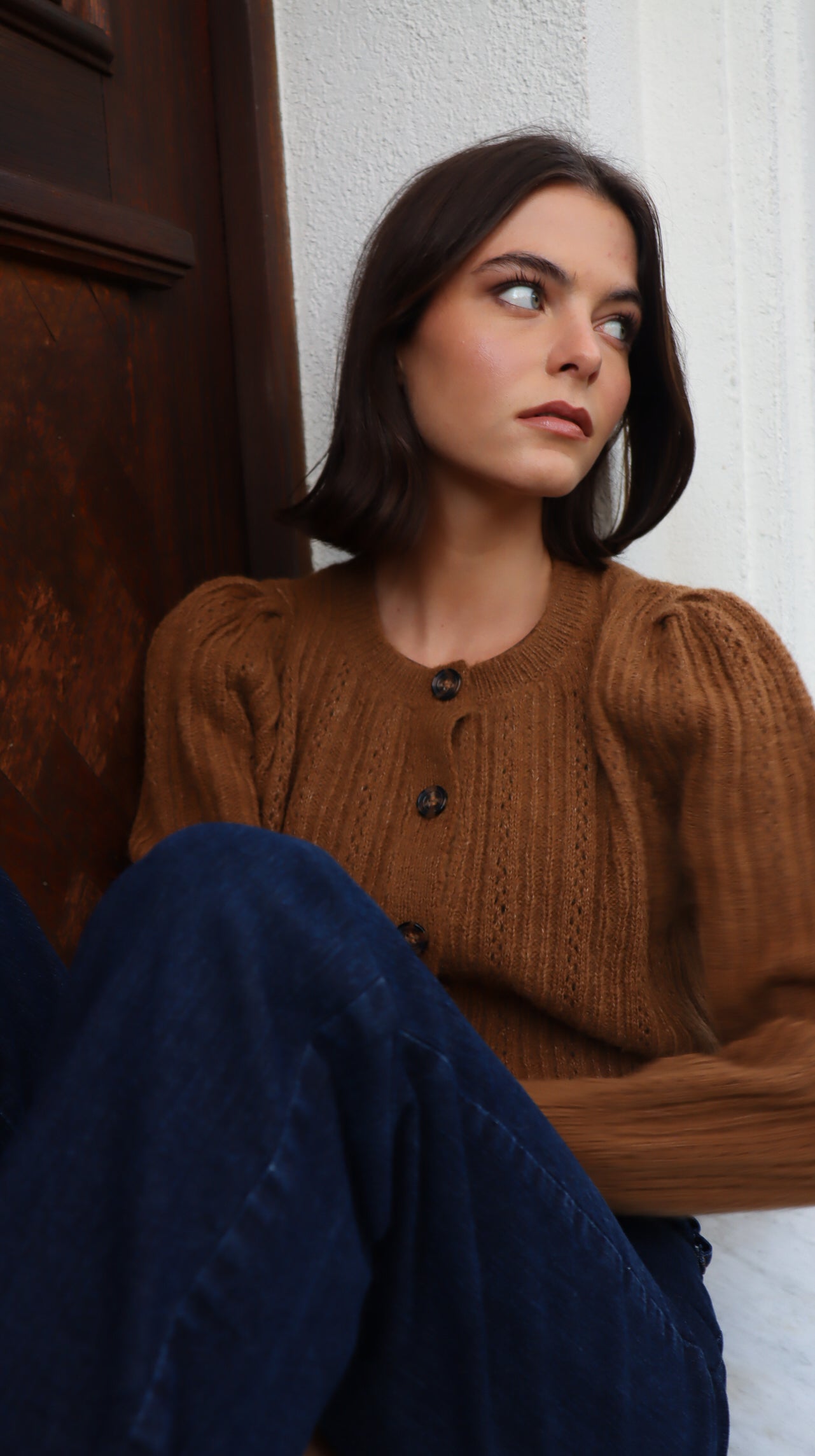Su diseño calado, combinado con mangas globo sutiles, aporta un toque moderno y único. El abroche de botones carey y el rib en los bordes aseguran un ajuste perfecto, convirtiéndolo en una opción versátil para cualquier ocasión.