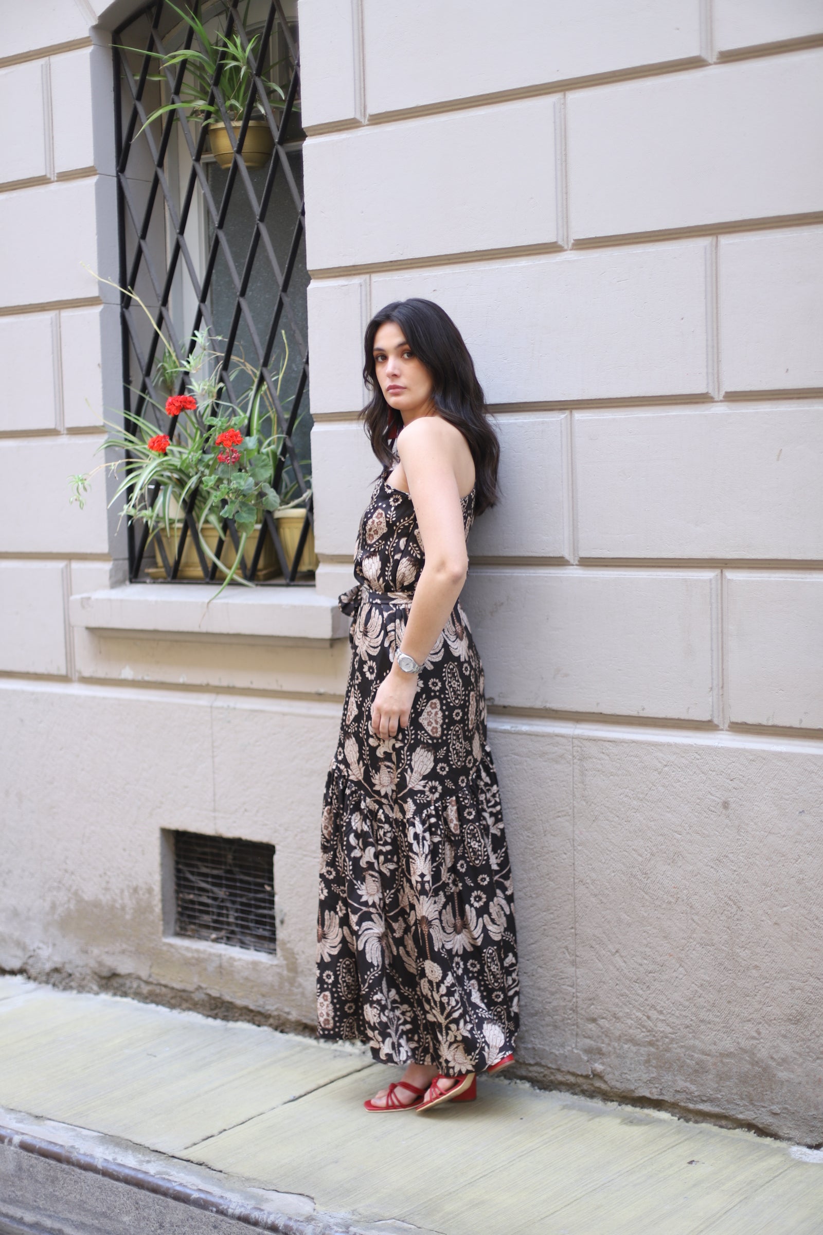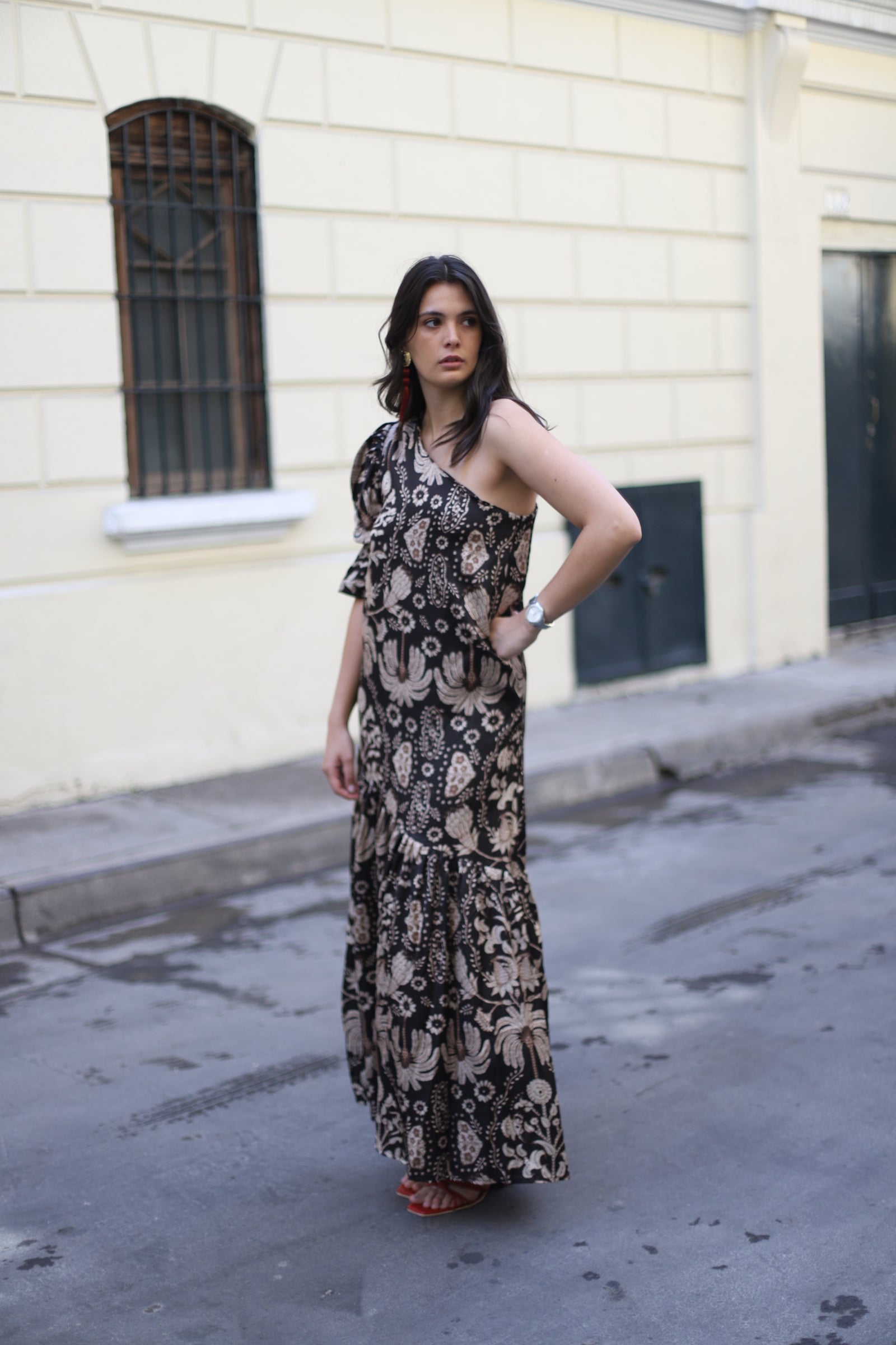 Este vestido ha sido diseñado para favorecer todo tipo de cuerpo, combinando sofisticación y movimiento en cada detalle. Su hombro asimétrico con un delicado panal en la manga le da un toque único, mientras que el vuelo en el ruedo aporta dinamismo y elegancia. Incluye un lazo ajustable en la cintura, permitiéndote adaptarlo a tu silueta para un calce perfecto.
