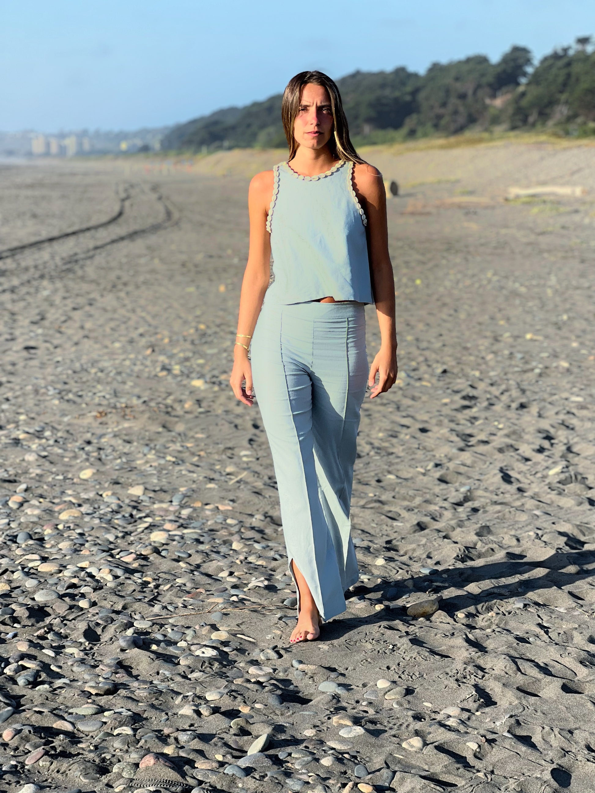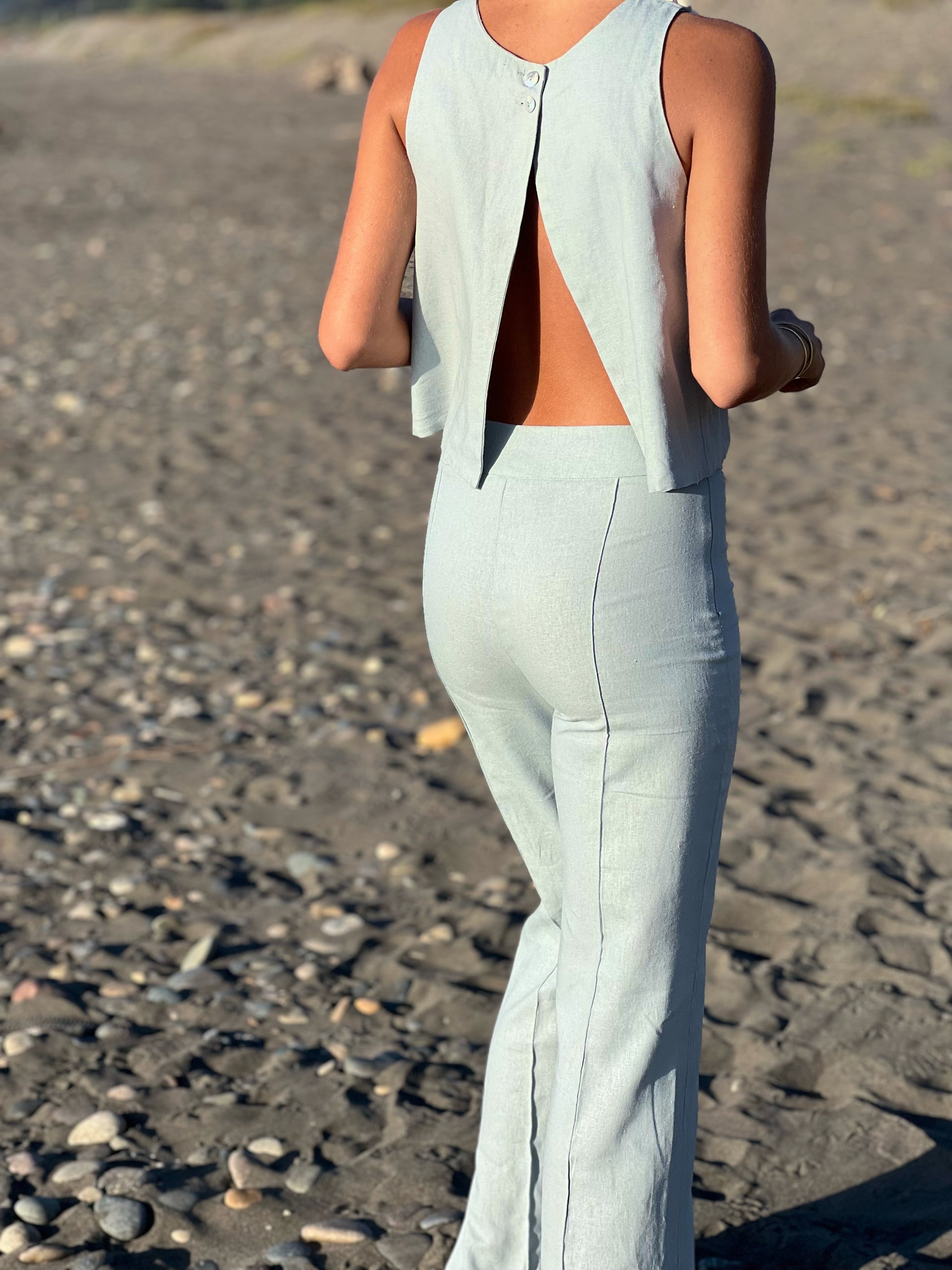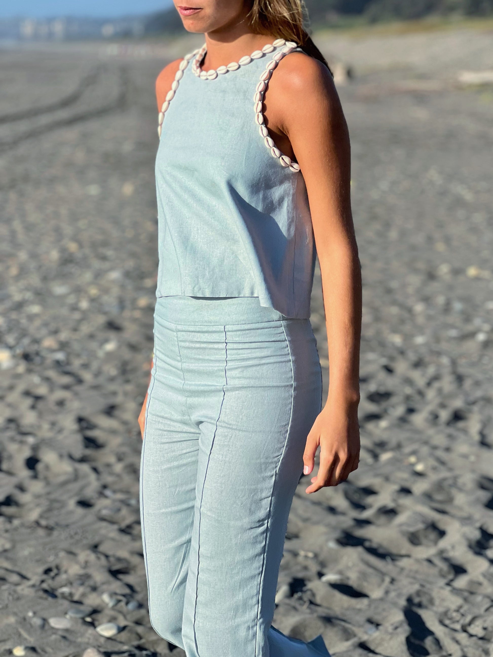 Nuestro Pantalón Praia en un suave tono celeste combina lino y viscosa, ofreciendo la mezcla ideal de comodidad y estilo. Su pinza central estiliza la figura, mientras que el cierre invisible lateral y los tajos en los costados aportan frescura y un toque elegante.