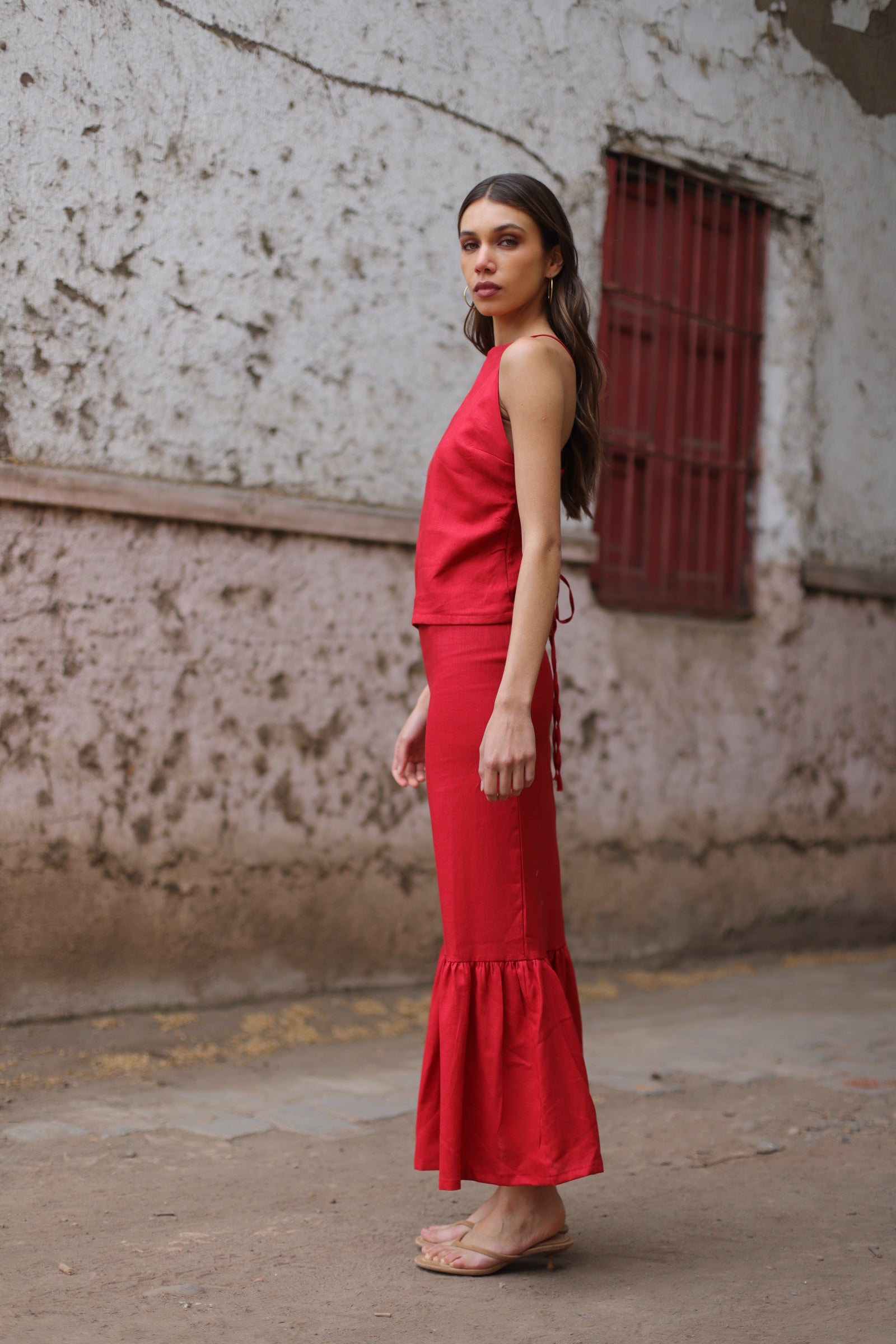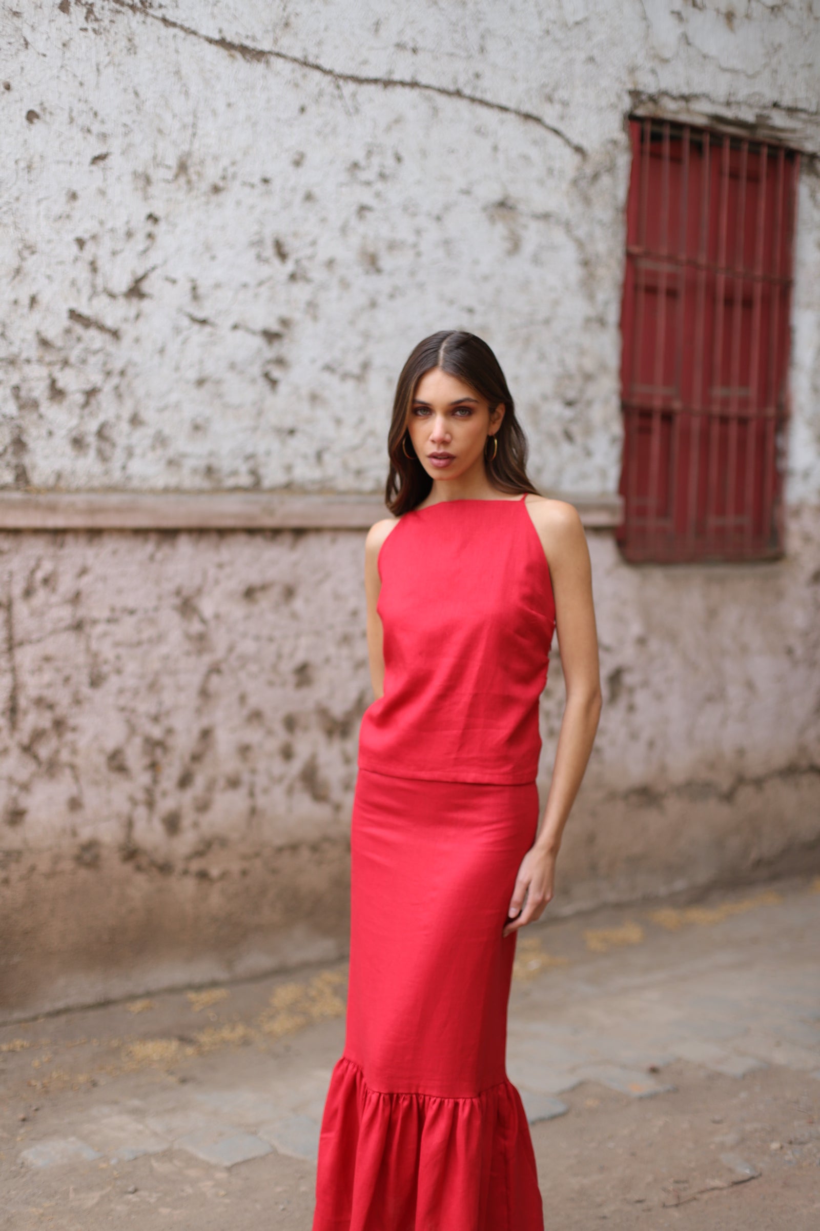 Cada pieza es hecha a mano en Chile, asegurando un acabado de calidad y atención al detalle. Puedes combinarla con nuestra Blusa Tania confeccionada en la misma tela y color, para lograr un look coordinado y sofisticado.