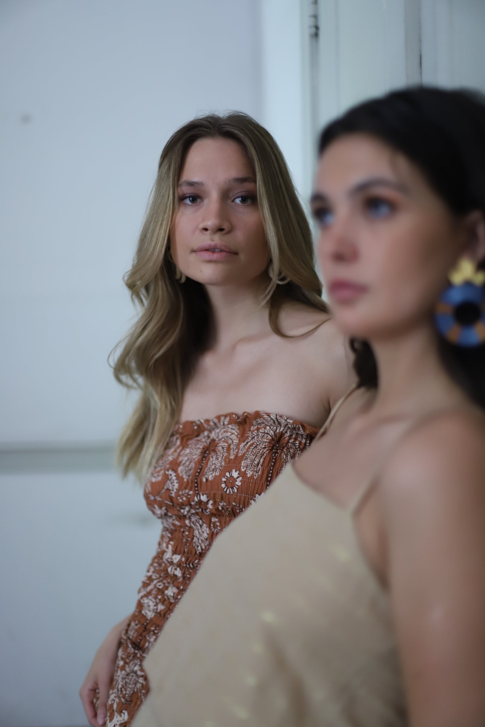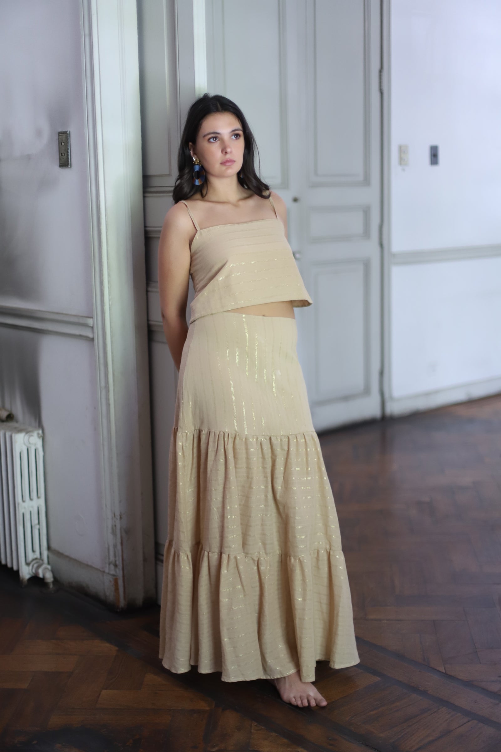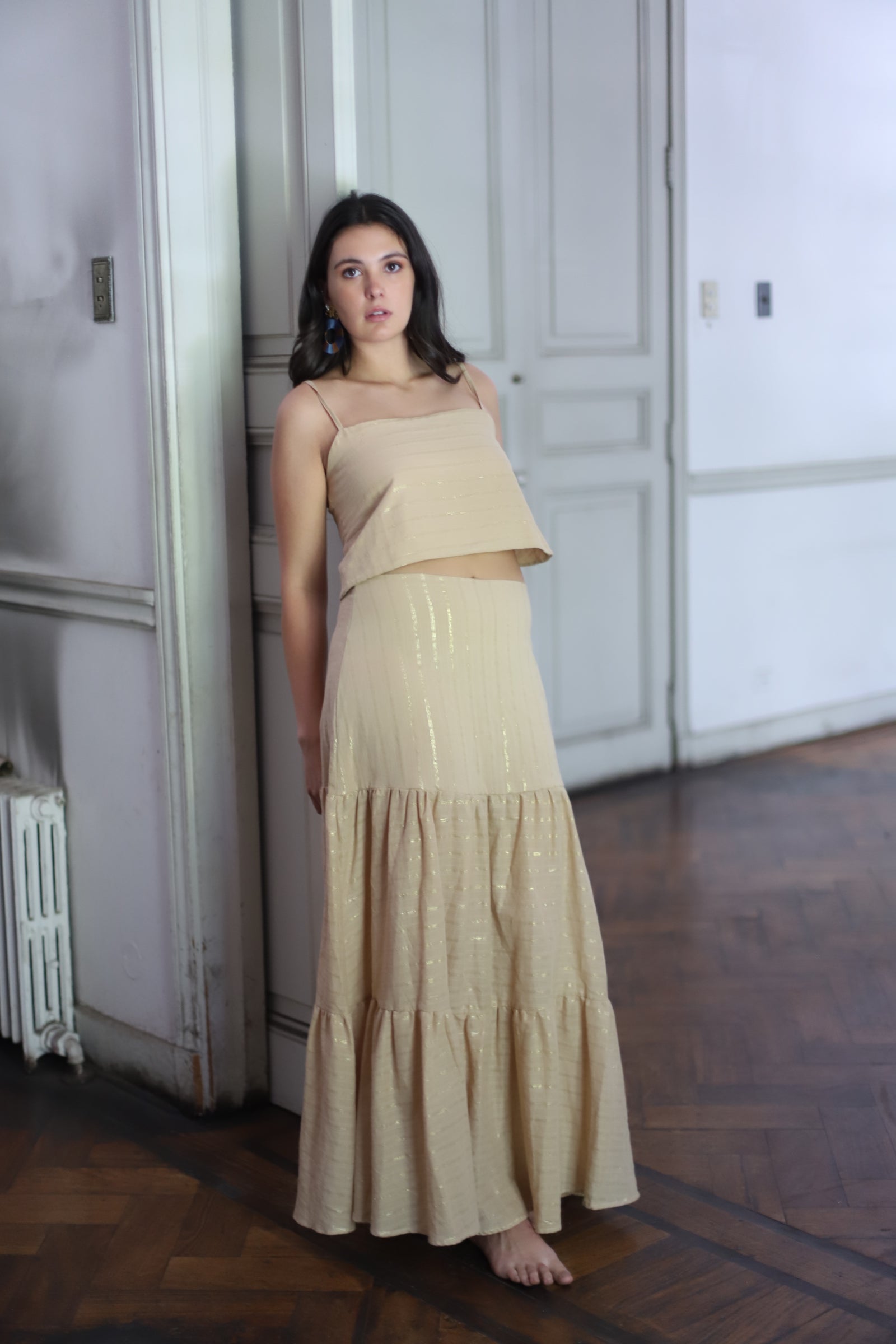 Este set está compuesto por una pollera con doble ruedo y un top de pabilo con escote cuadrado, diseñado con un lazo ajustable en la espalda para un calce perfecto.
