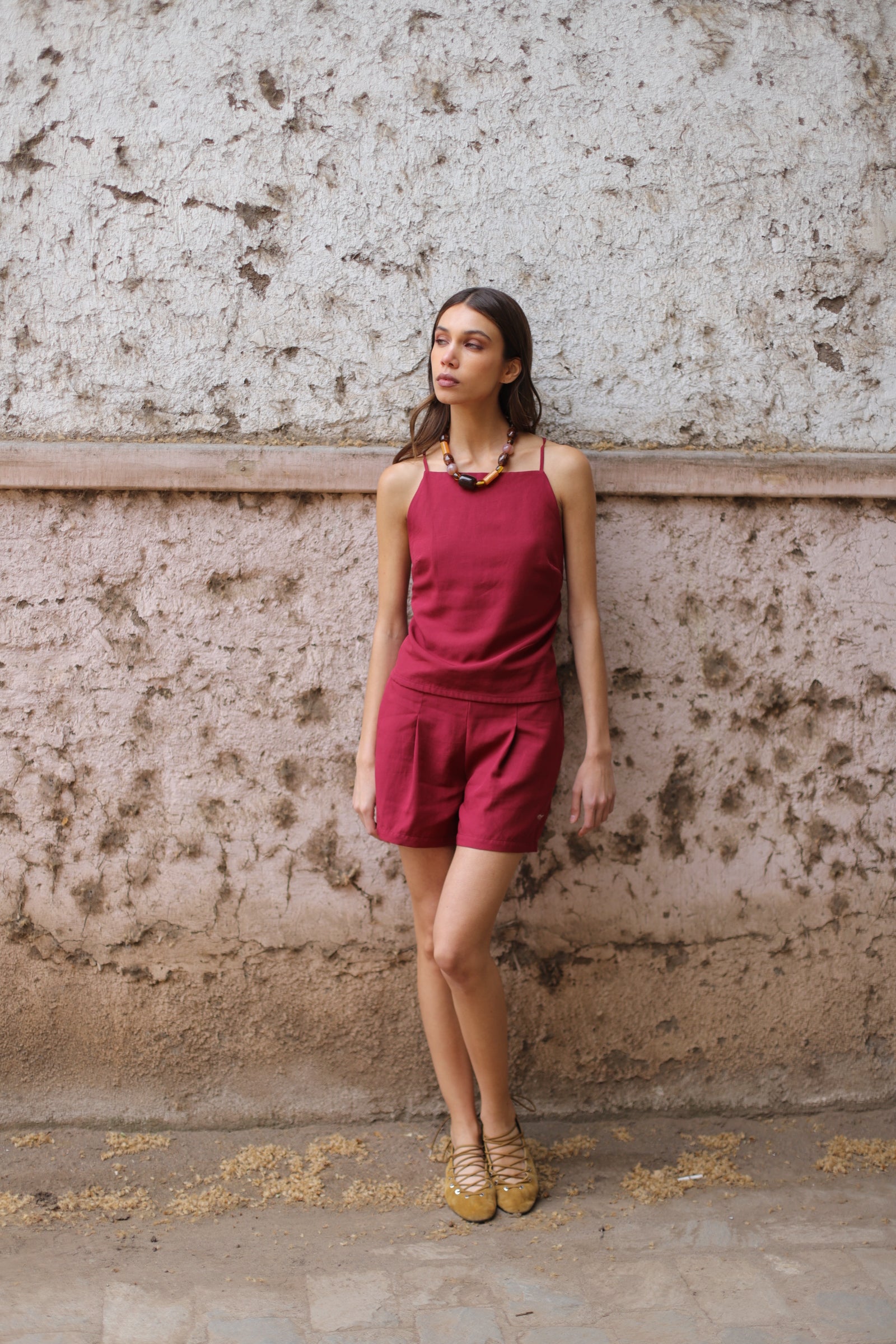 Short a la cadera confeccionado en una mezcla fresca y suave de 70% lyocell y 30% lino. Presenta una pinza en cada lado frontal, que aporta un toque elegante y sastrero, manteniendo un largo medio perfecto para el día a día.