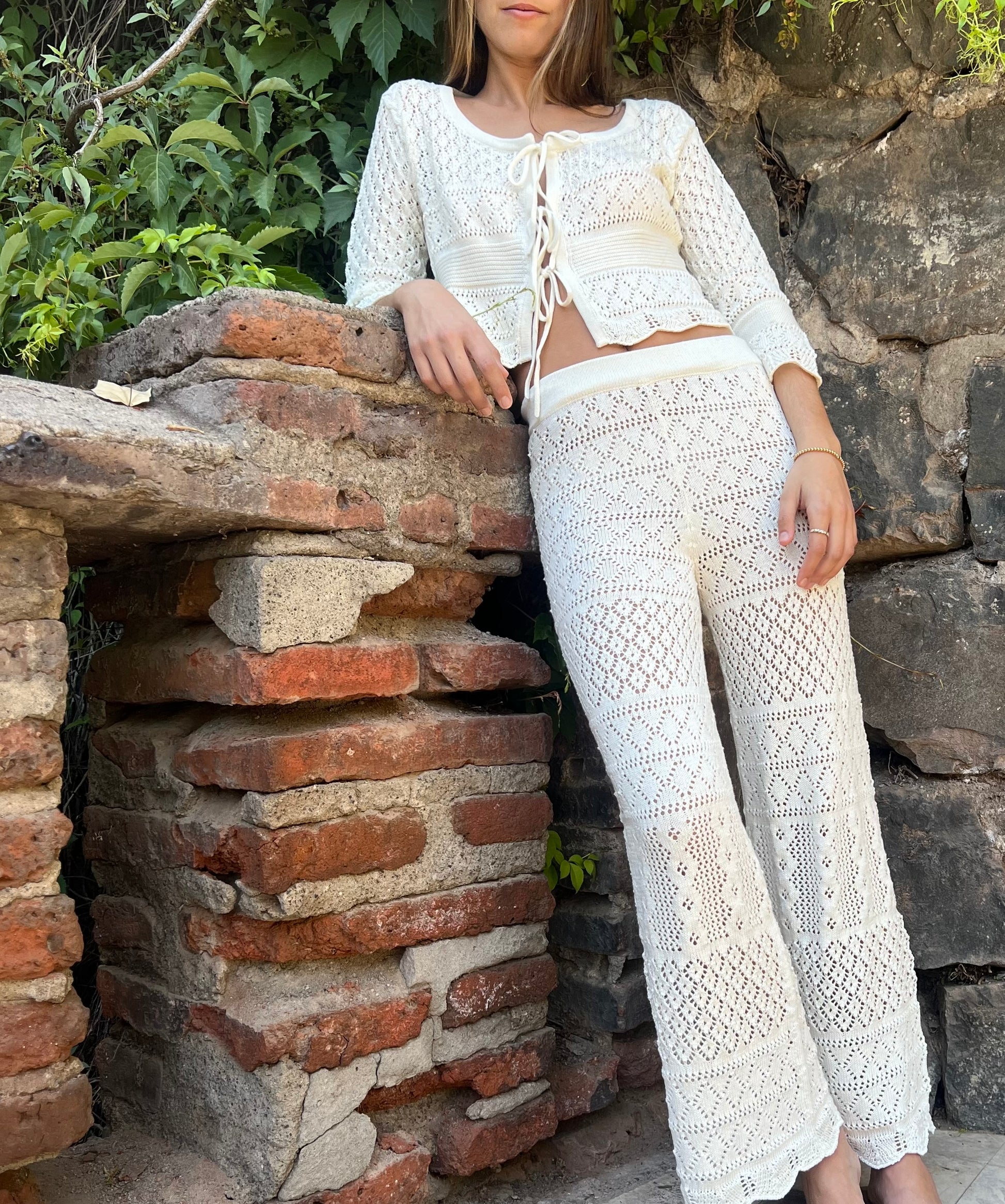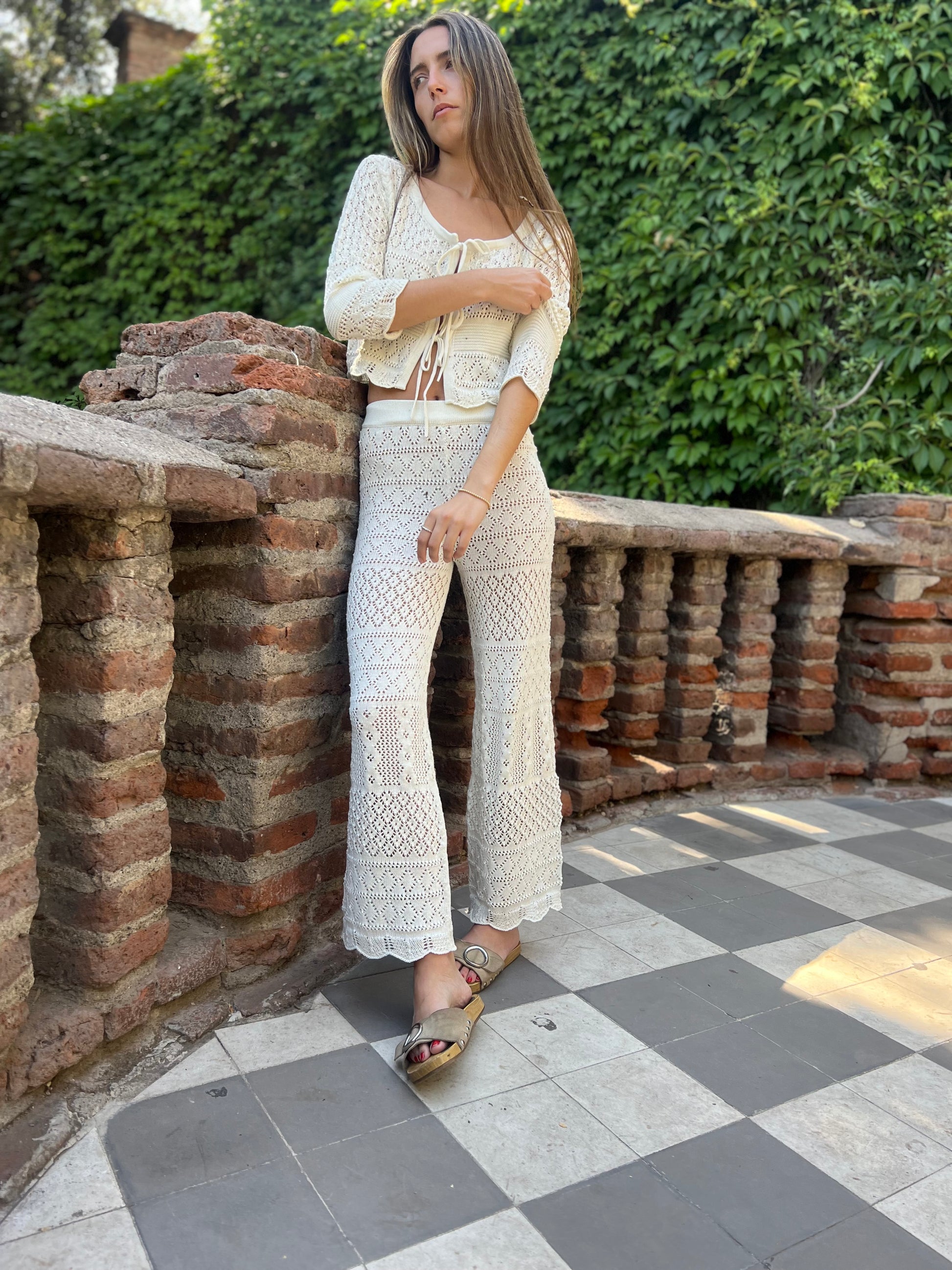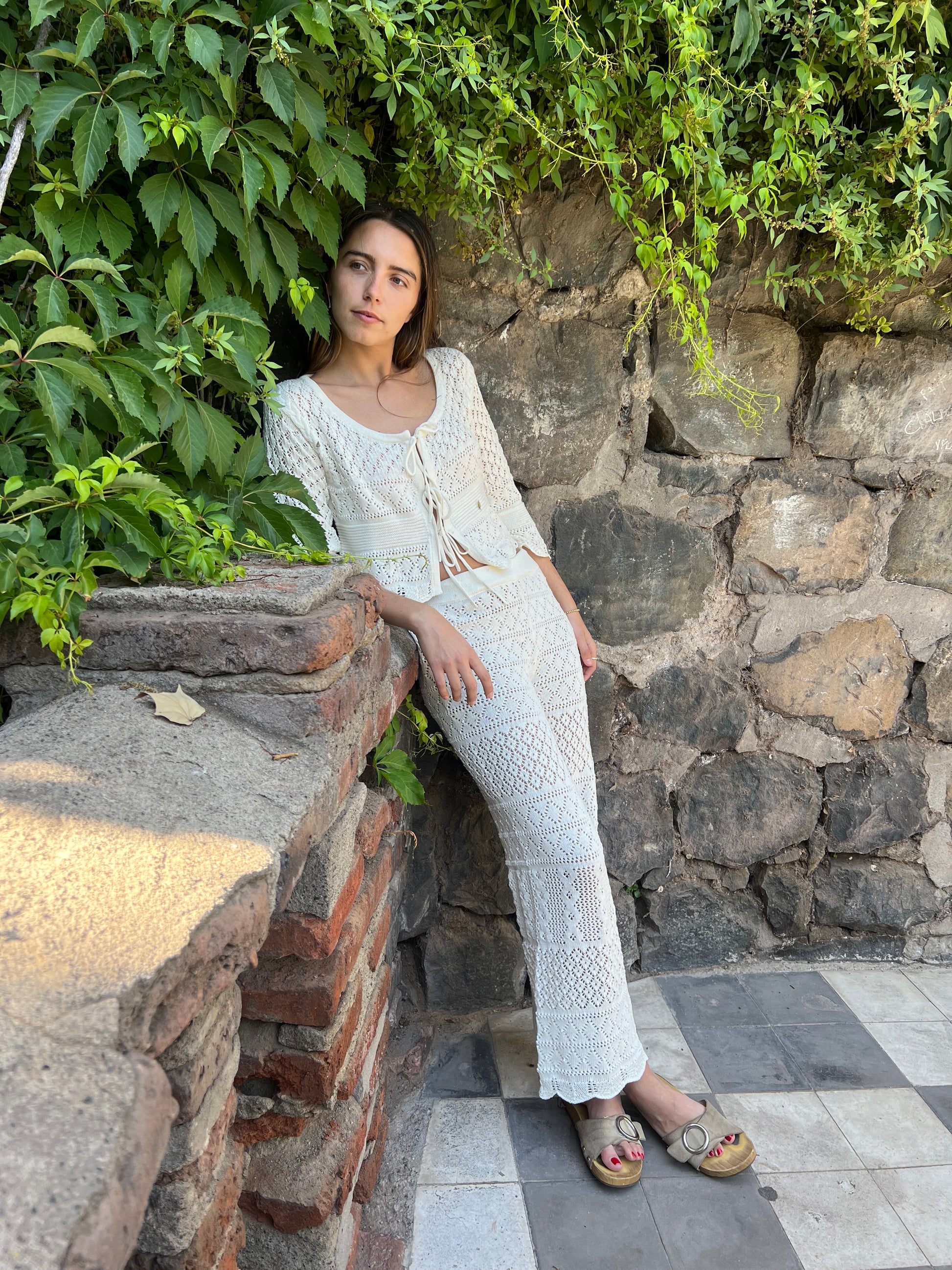 Chalequito / blusa tejida de cuello redondo, manga tres 3/4 y lazos para cierre central.