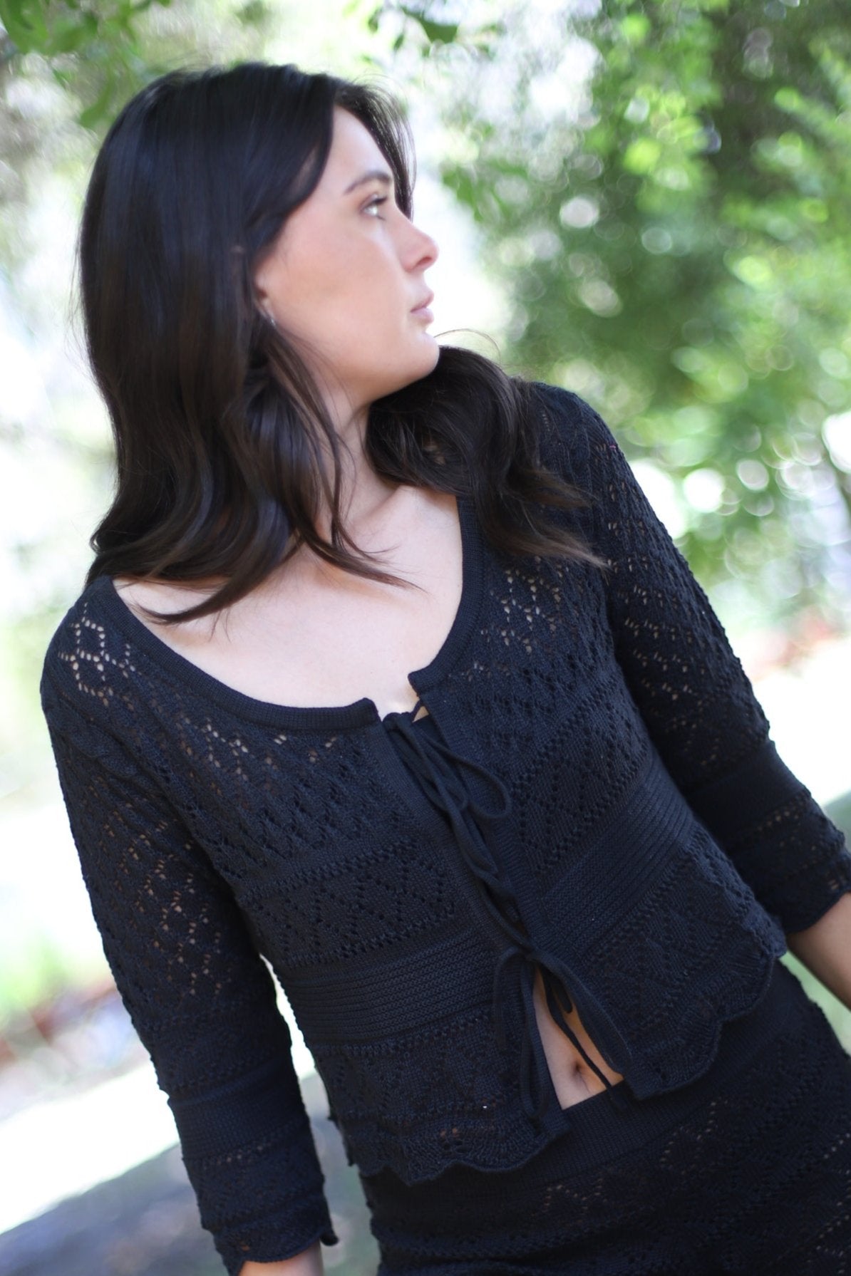 Chalequito / blusa tejida de cuello redondo, manga tres 3/4 y lazos para cierre central.