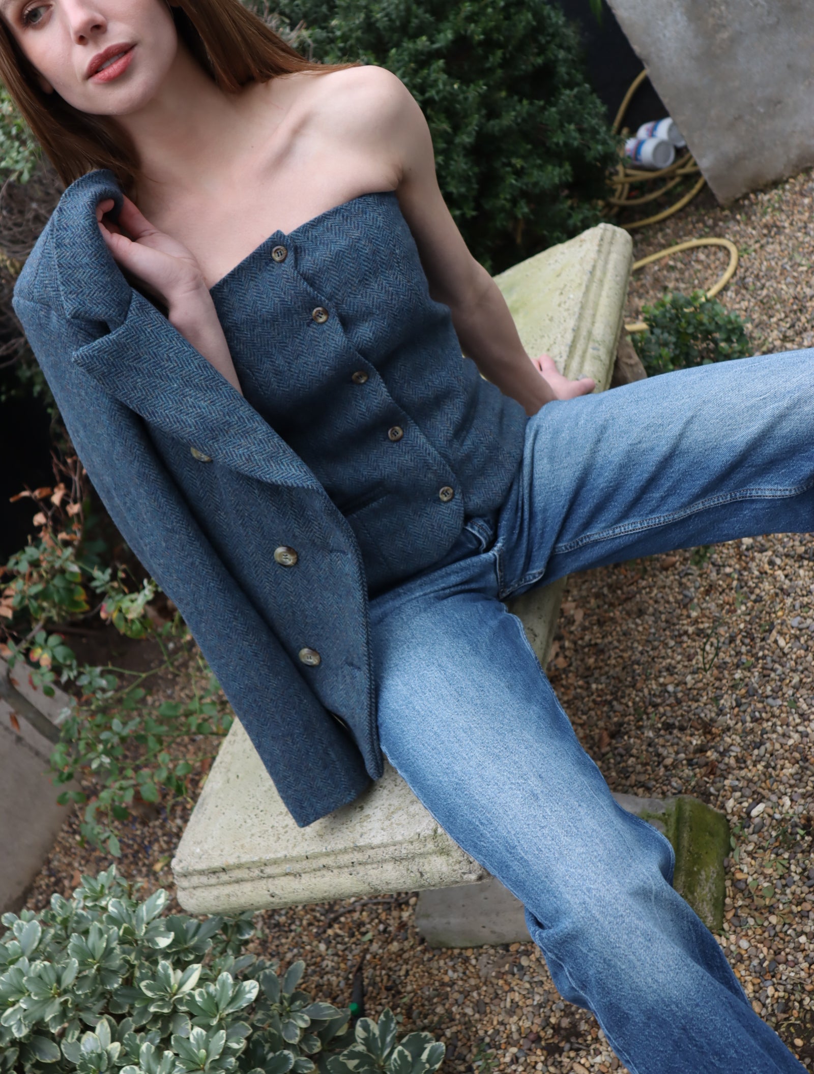 Este top strapless tipo corset está confeccionado en 100% lana con un tejido de textura tweed fina, ideal para aportar estructura, calidez y sofisticación. Su diseño de corte entallado, con costuras marcadas y botones al frente, realza la silueta y aporta un look elegante y atemporal.