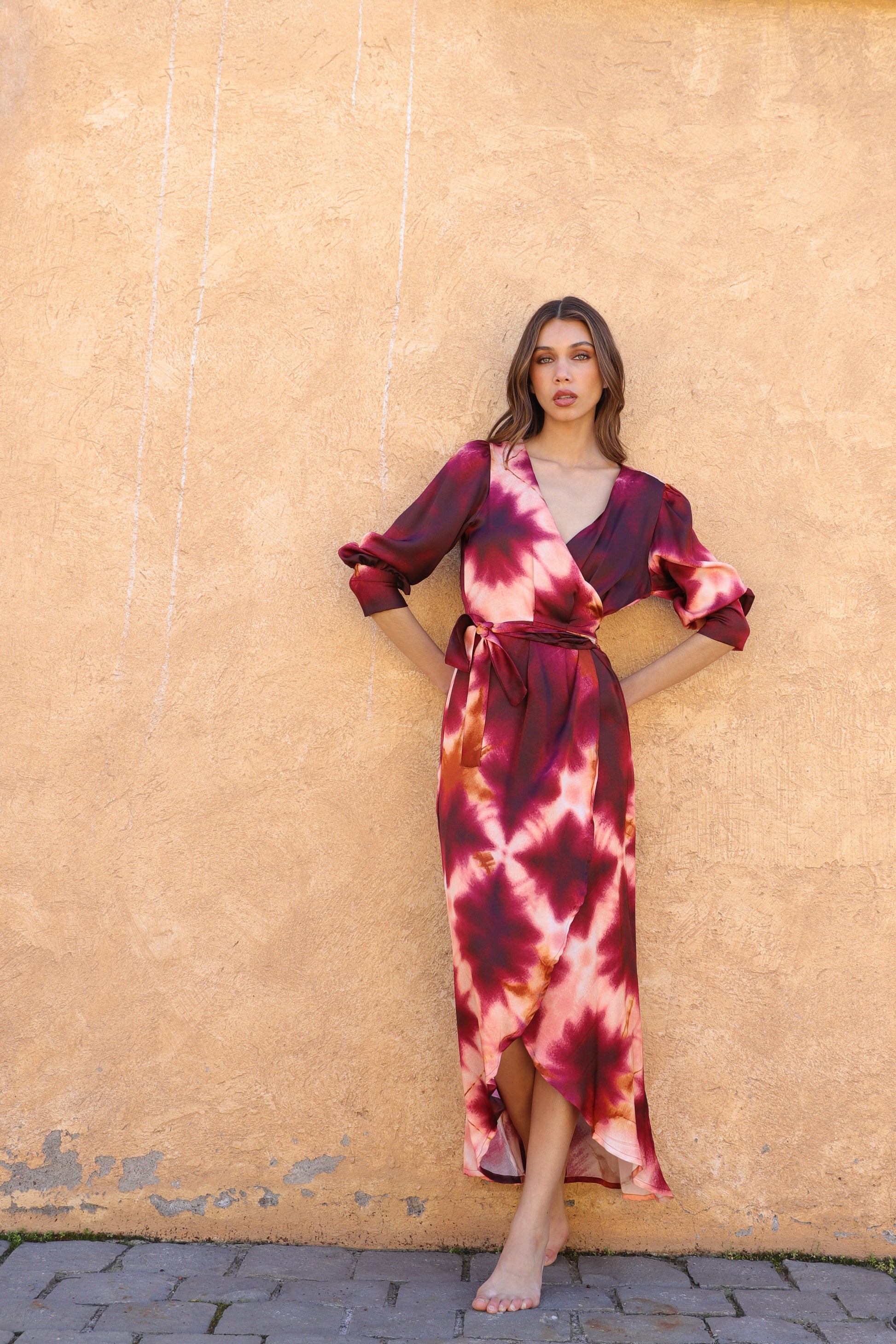 Confeccionado en suave tela de viscosa/rayón satinada, el vestido tiene un brillo sutil y refinado que lo hace ideal para ocasiones especiales. El estampado tie dye en tonos burdeos aporta una dosis de sofisticación y calidez, haciendo de cada prenda una pieza única.