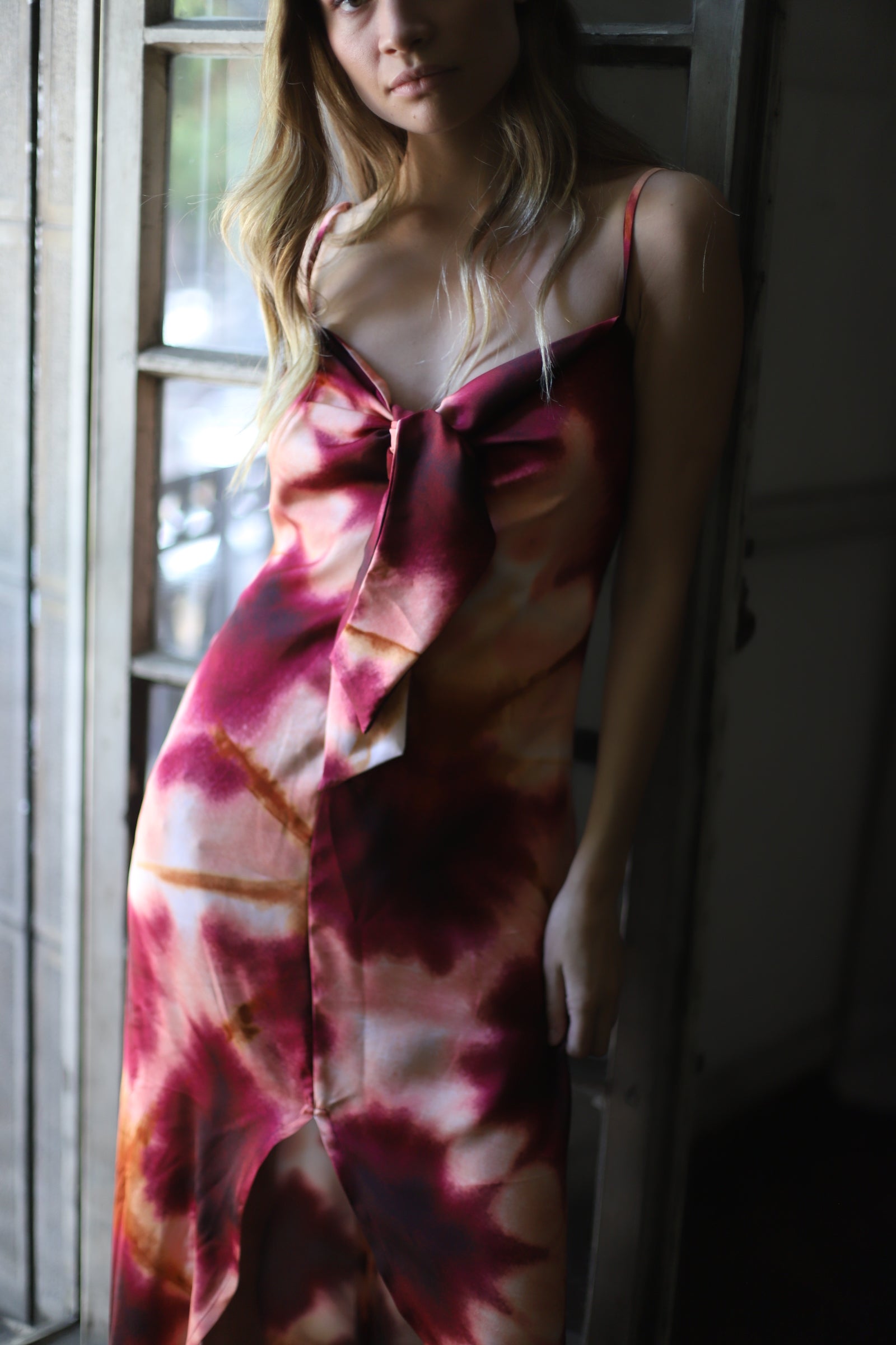 Confeccionado en una suave tela de viscosa/rayón satinada, tiene el brillo perfecto para aportar esa versatilidad que define nuestros vestidos. Su exclusivo estampado de autor, diseñado por la marca, presenta un motivo shibori abstracto en tonos cálidos de burdeo.