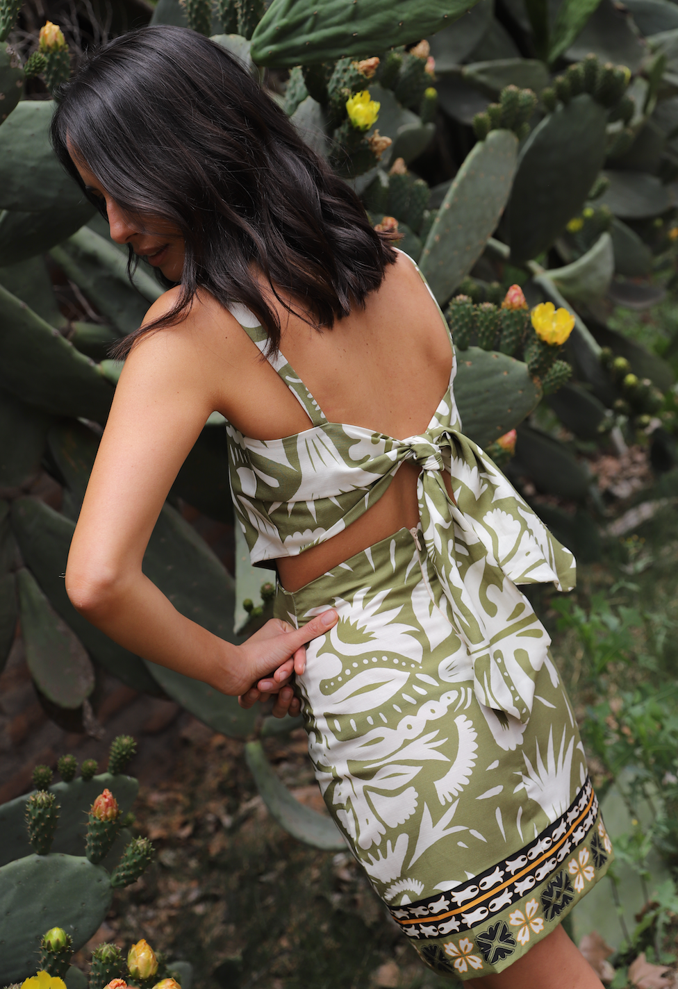 Vestido cut out con escote recto, espalda anudada y cierre invisible.