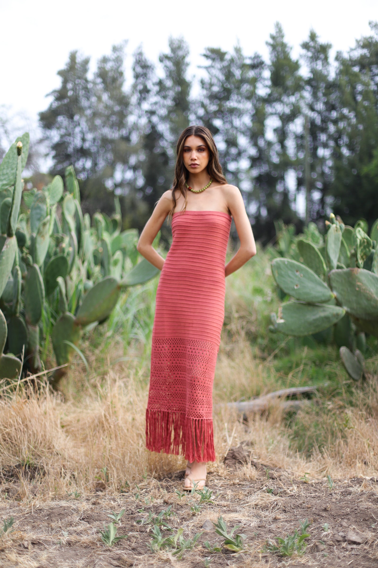 Este vestido tejido en tono terracota combina artesanía y sofisticación en una pieza única. Confeccionado en 100% algodón y hecho en Perú, destaca por su textura suave y su caída natural, ideal para quienes buscan comodidad sin renunciar a la elegancia. Su diseño strapless abraza la silueta con un tejido parejo en la parte superior, mientras que la zona inferior incorpora un tejido calado y flecos que aportan movimiento y un acabado artesanal encantador. Un sutil lurex dorado recorre el tejido, añadiendo un brillo delicado que realza la prenda y la convierte en una opción perfecta para ocasiones especiales o looks de verano con un toque distintivo.