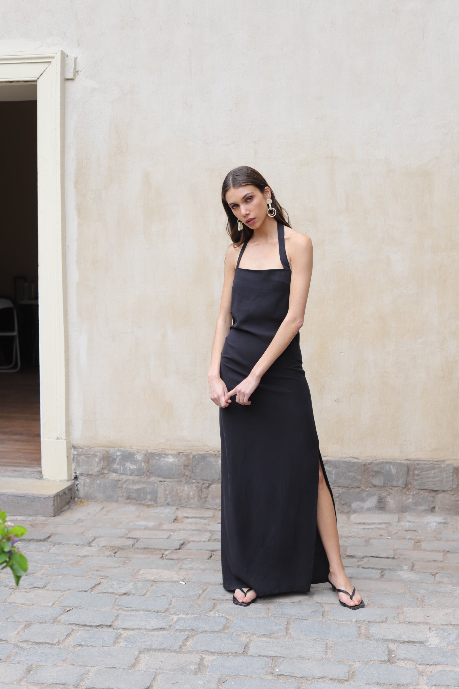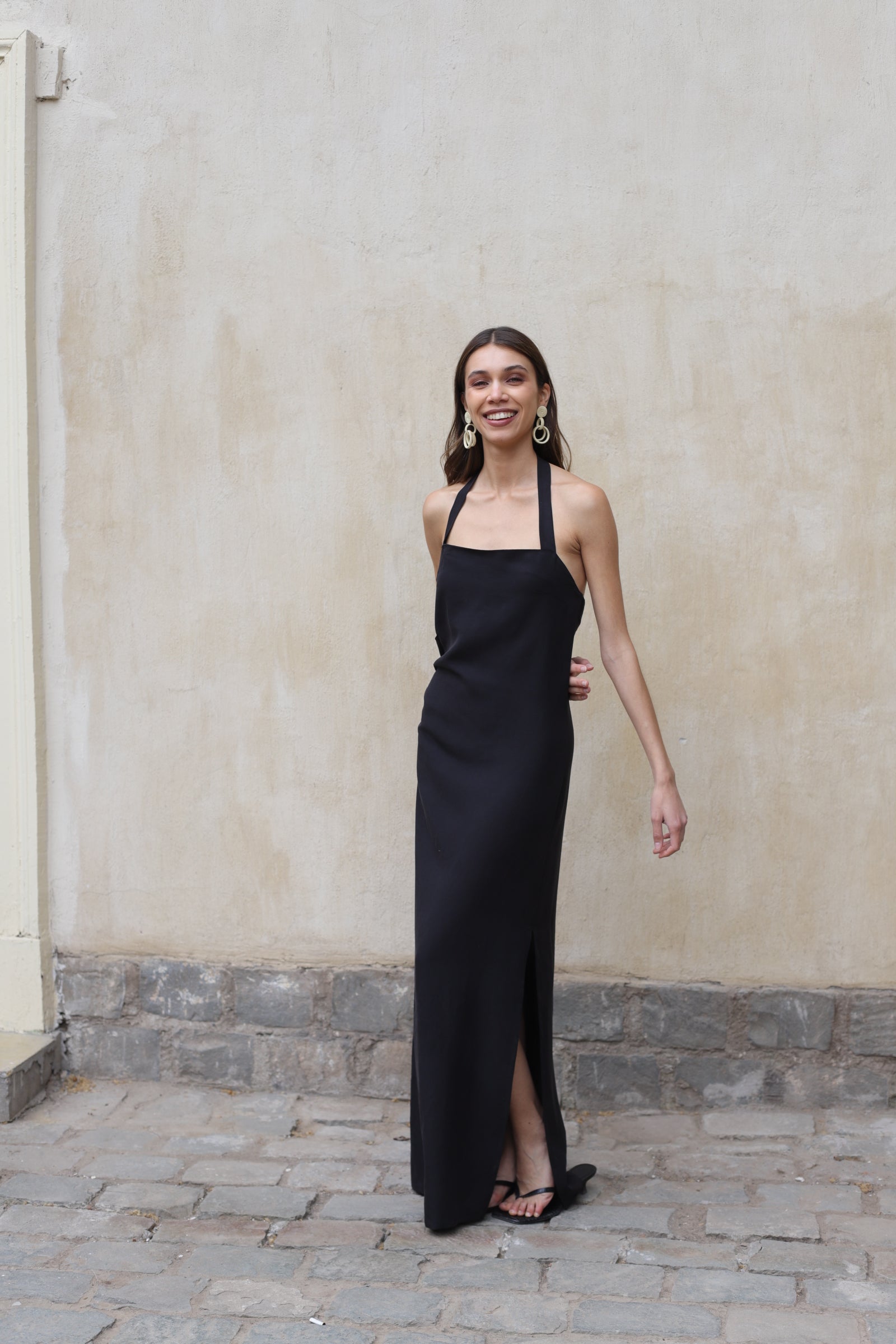 Vestido largo de silueta limpia y elegante, diseñado para realzar la figura con una caída fluida y sofisticada. Presenta escote recto con tirantes tipo halter que se ajustan en la parte posterior del cuello mediante dos botones, permitiendo un calce cómodo y regulable. La espalda queda completamente descubierta, aportando un diseño delicado y equilibrado. Incorpora suaves plizados en un costado, que aportan textura y movimiento, favoreciendo la caída de la prenda.